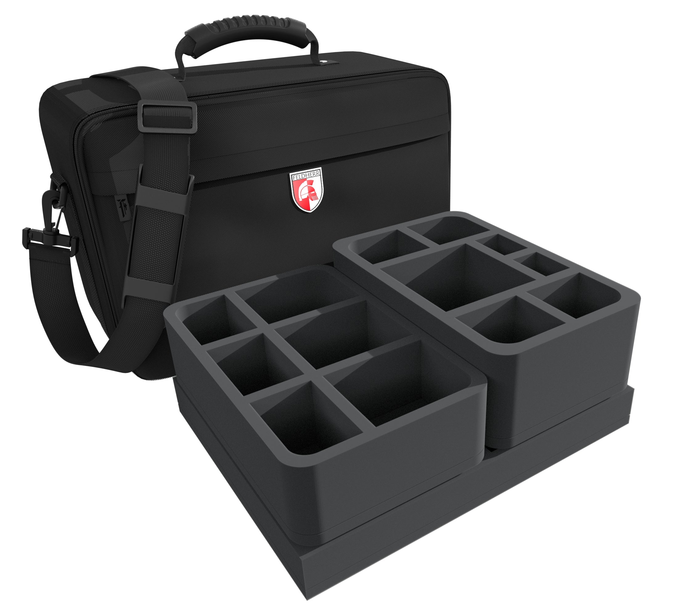5 dioses, 30 guerreros, 11 guardianes y el material de juego que los acompaña quieren ser empaquetados esta vez. Por suerte, tenemos preparada la bolsa MAXI a juego con bandejas de espuma Feldherr personalizadas. Con ella, podrás transportar de forma segura todas las miniaturas y material de juego a la próxima batalla. Con espacio para los peones gato exclusivos de Kickstarter y las fichas de Horus.
