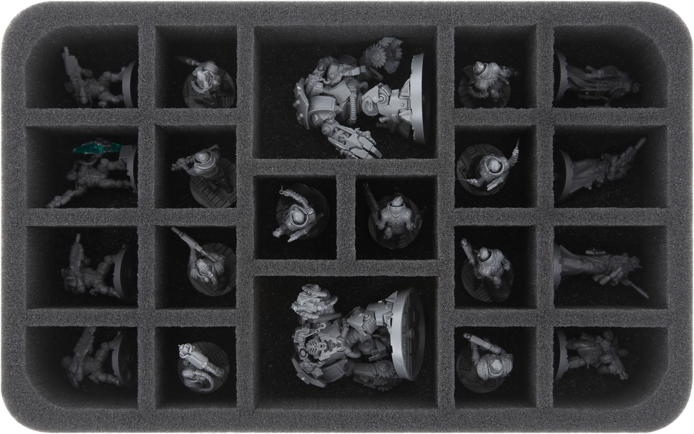 La bandeja HSMEDN055BO tiene 20 compartimentos. Los dos compartimentos grandes pueden acomodar con seguridad a dos Ambots, los 18 compartimentos más pequeños son adecuados para pandilleros como por ejemplo Miniaturas de los Delaque o los Cawdor Gangs.