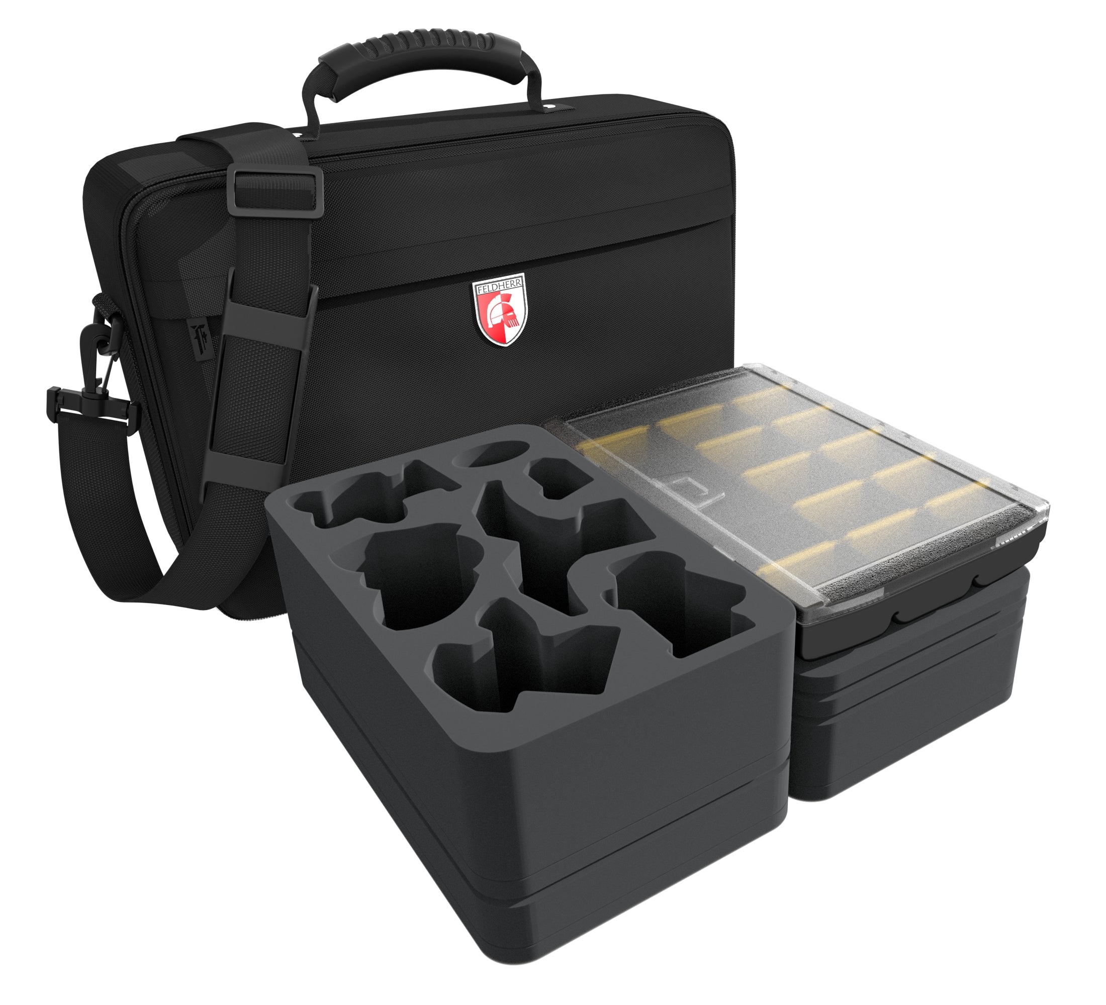 La cómoda bolsa MEDIUM está hecha de un material especialmente resistente. Además, los paneles laterales acolchados y un fondo reforzado garantizan que sus miniaturas estén protegidas de forma óptima de las influencias externas, incluso cuando se transportan en coche o en tren. Además del gran compartimento principal, el bolso tiene un bolsillo más pequeño con cremallera en la parte delantera. Aquí puedes guardar folletos y otras piezas pequeñas.