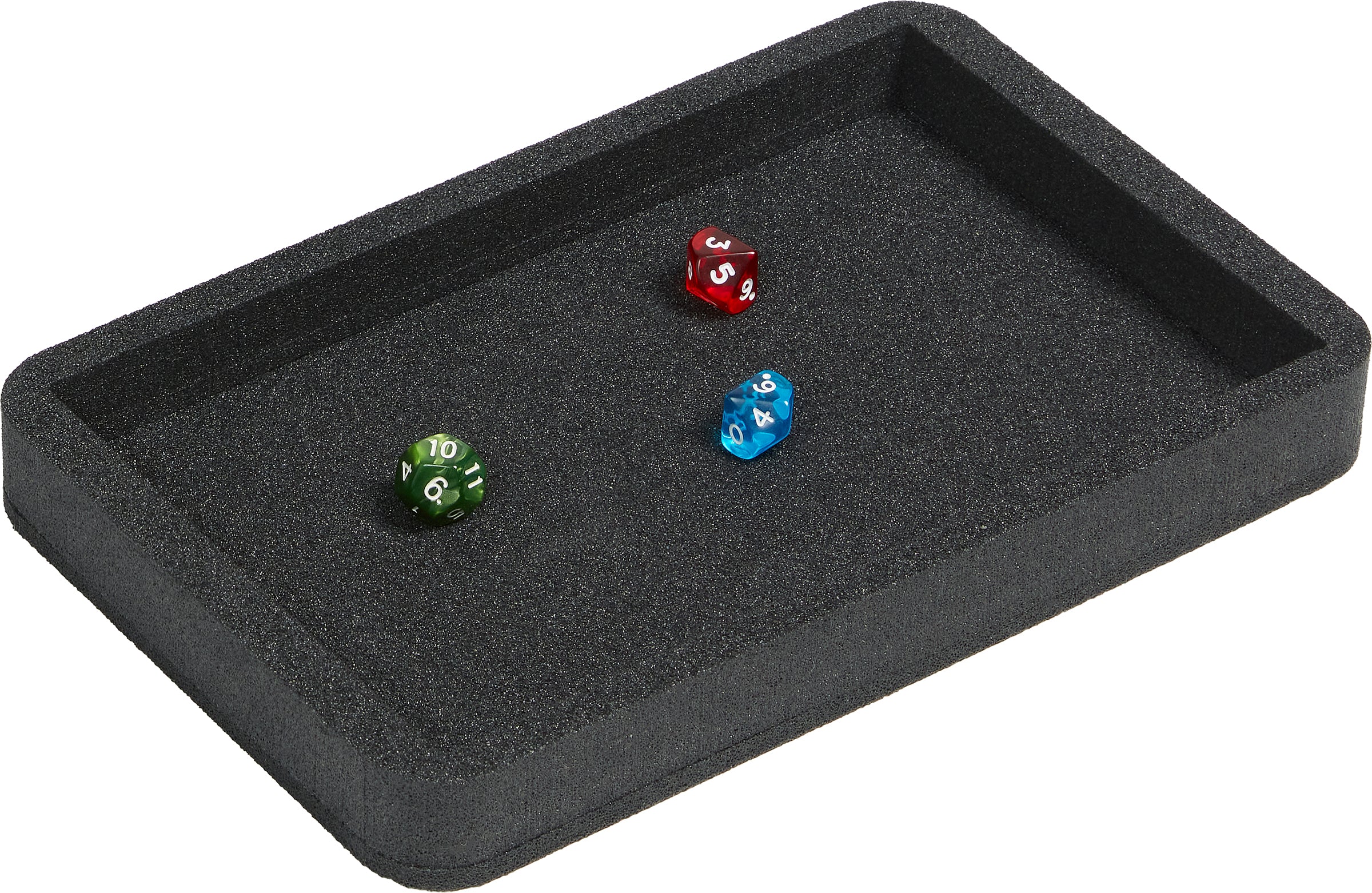La bandeja tiene un borde de 25 mm de altura. Así que los dados permanecen en la base y la espuma sólida de PE asegura que los dados caigan silenciosamente y que no reboten demasiado.