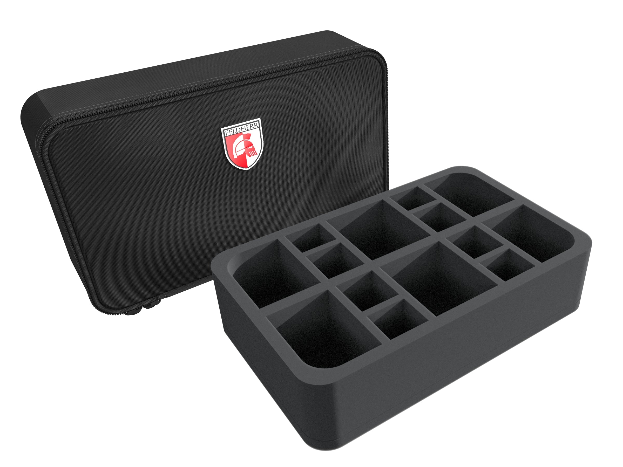 No te preocupes; tenemos la solución adecuada para tus modelos atletas. Este compacto Feldherr MINI bolsa, que incluye un espuma personalizado, ofrece espacio para hasta 14 miniaturas sobre bases de 25 mm y 50 mm. Gracias al Feldherr Half-Size bandeja de espuma de alta calidad, ¡podrás transportar tus figuras sin preocupaciones al próximo evento de Rumbleslam!