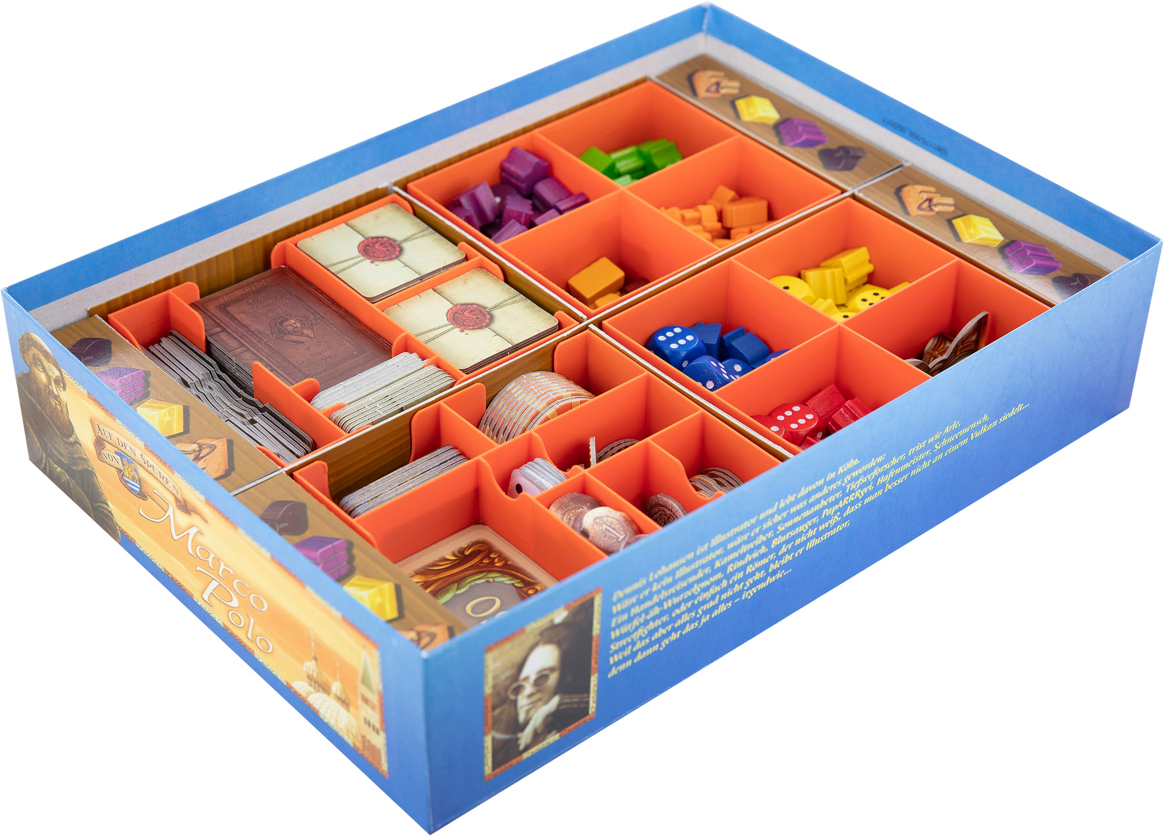 - El organizador ofrece espacio para todos los componentes del juego básico "Los viajes de Marco Polo", así como para las expansiones "Agentes de Venecia" y "Los nuevos personajes".