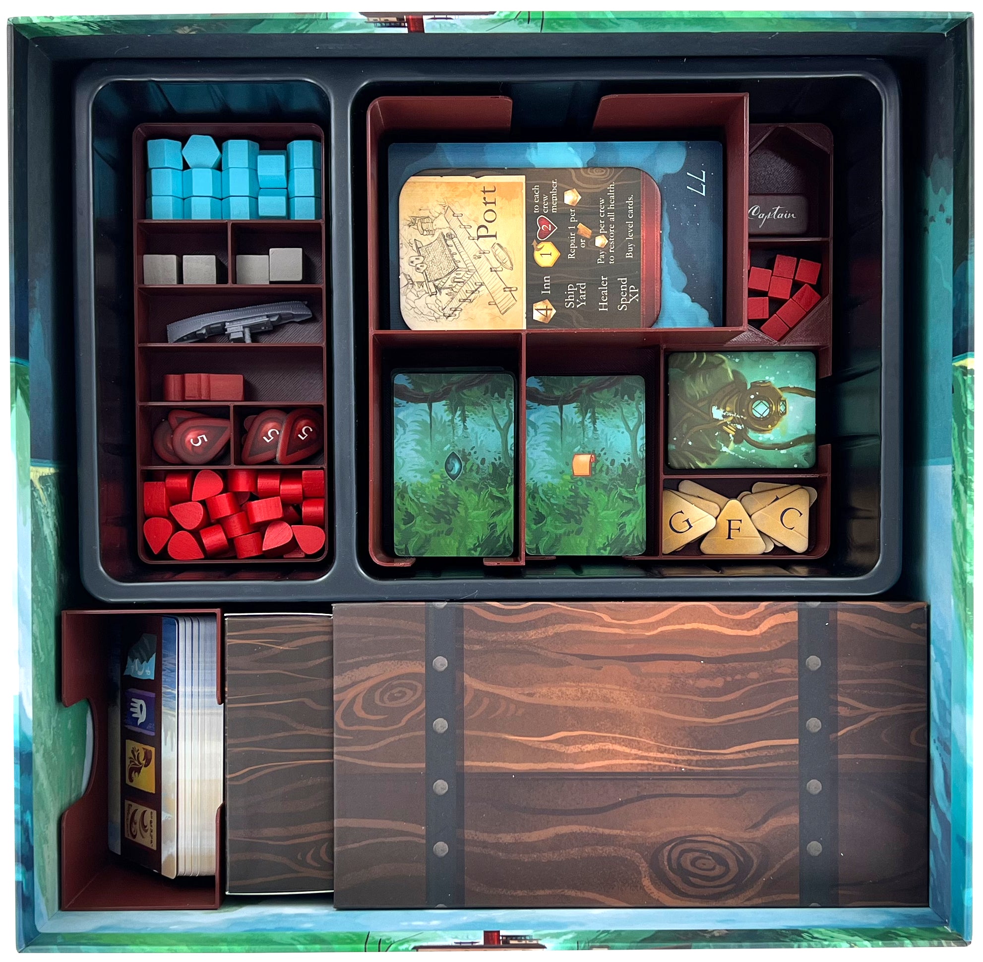- 1 portatarjetas de plástico con siete compartimentos para cartas de gran formato como las Cartas de Enemigo + cartas de pequeño formato como las Cartas de Habilidad + material de juego de pequeño tamaño como los Cubos de Daño de Barco, las Fichas de Exploración, la Ficha de Capitán + fichas como las Fichas de Tablero de Puerto, las Fichas de Traje de Buceo, las Fichas de Poción de Polen< /li>