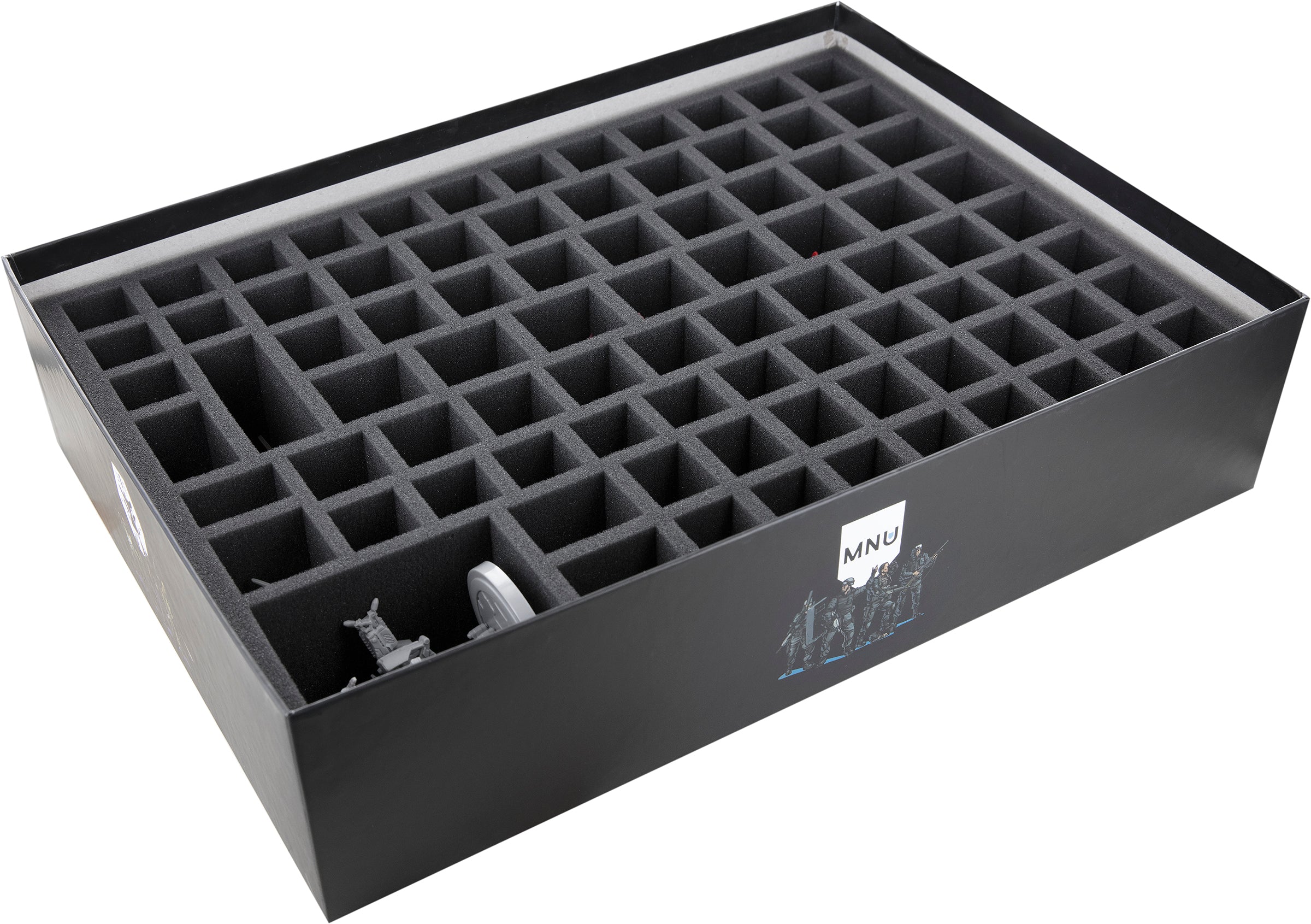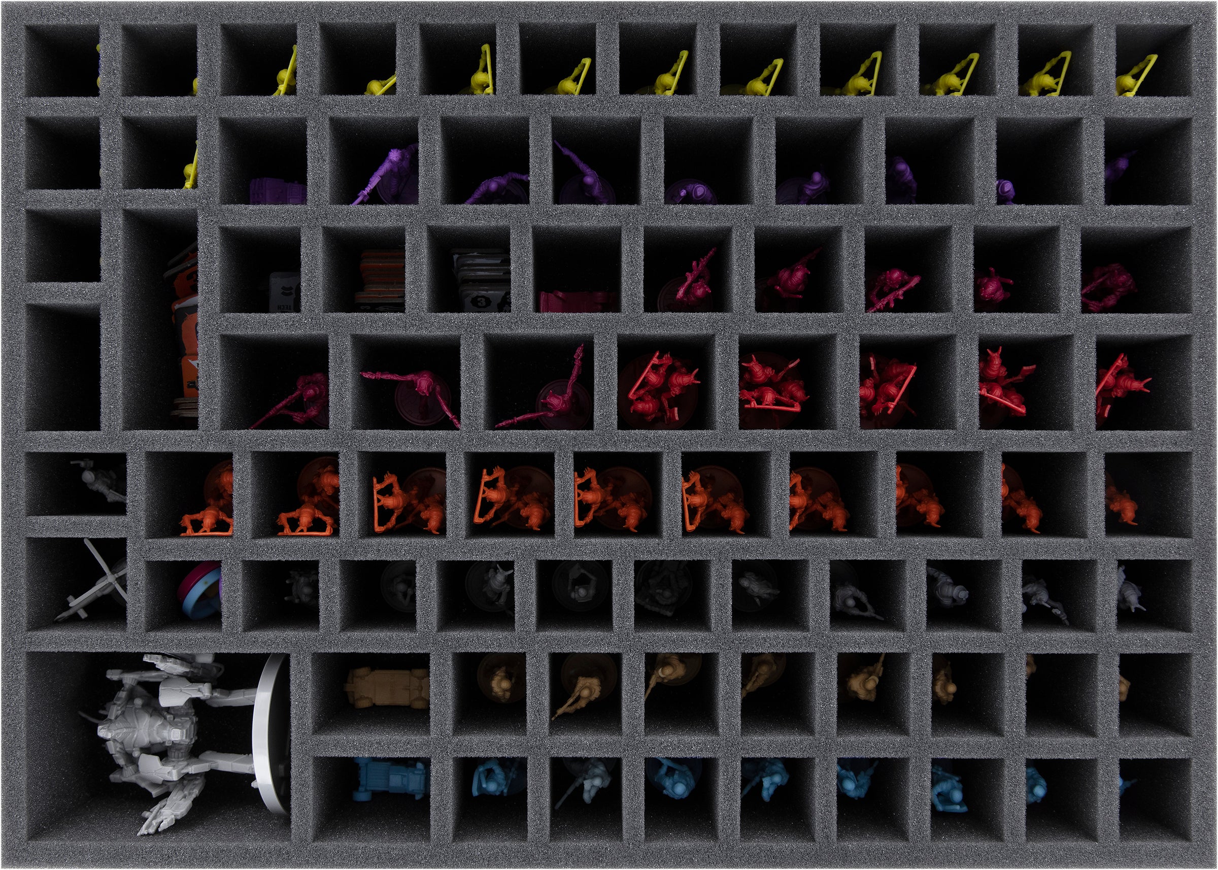 - 1 bandeja de espuma con 85 compartimentos para miniaturas y material de juego de pequeño tamaño como fichas de mech, fichas de base de facción, fichas de puesto avanzado, rastreadores de estados y anillos de facción
