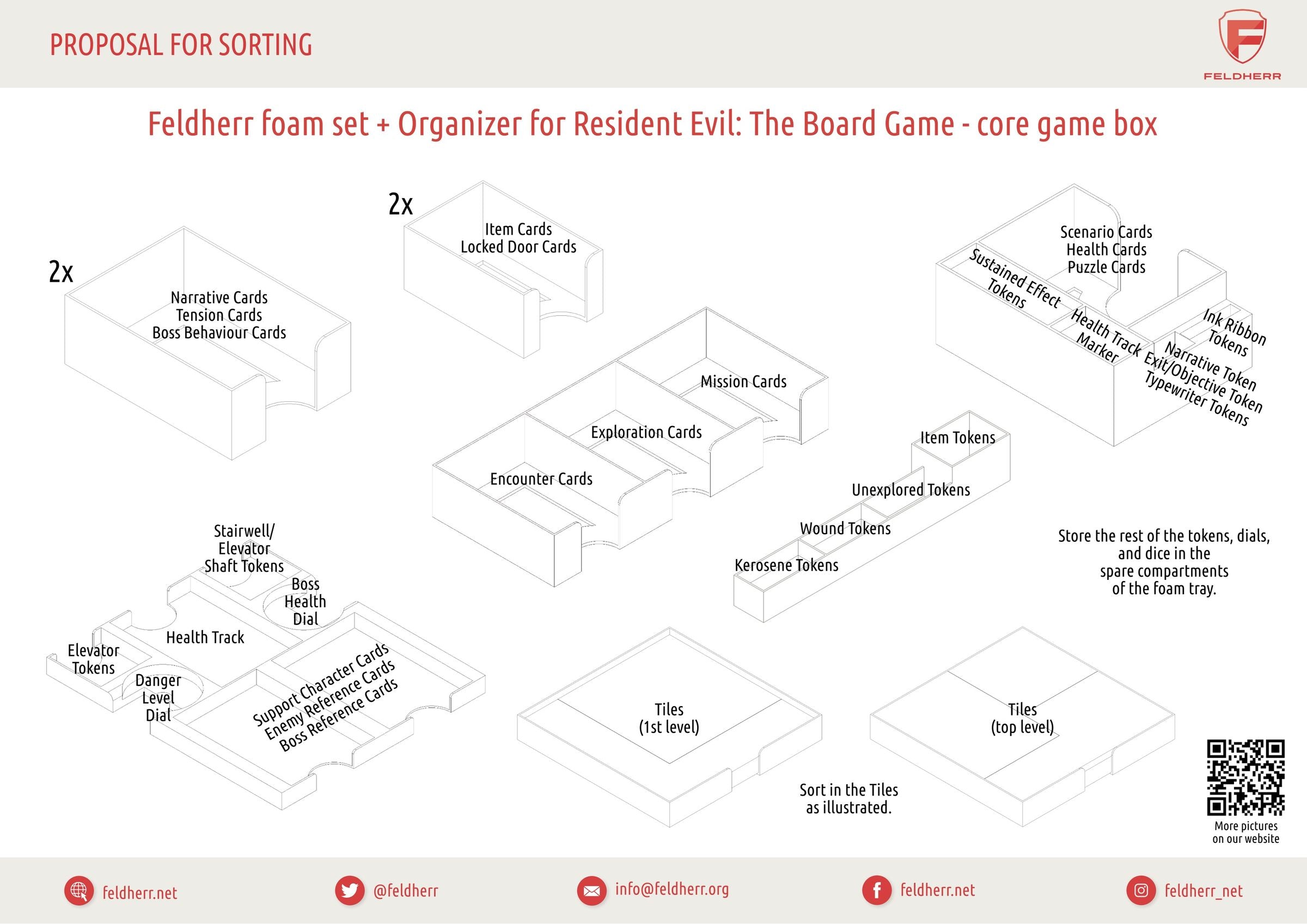 Para evitar que el material de juego quede sin clasificar y proteger tu miniaturas de posibles mutilaciones, te ofrecemos un set espuma a juego con inserciones Organizer para Resident Evil. De este modo, tu material de juego estará ordenado y el suave espuma protegerá tus figuras de arañazos, miembros rotos y mordiscos.