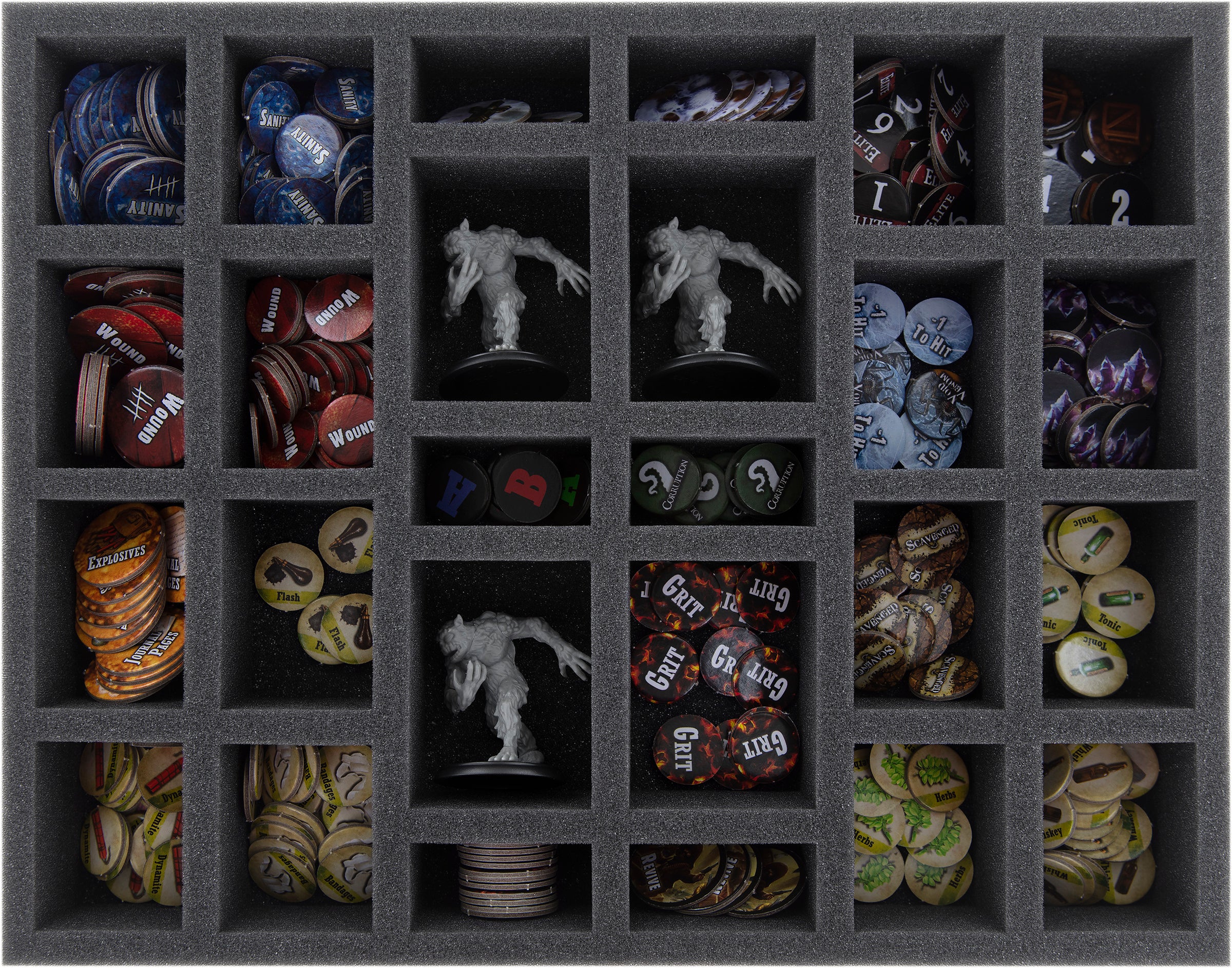 Esta bandeja de espuma está dividida en 26 compartimentos. Son ideales para el almacenamiento y transporte protegido de las miniaturas de la serie Shadows of Brimstone. El material del juego, como fichas y dados, también se puede clasificar claramente aquí.