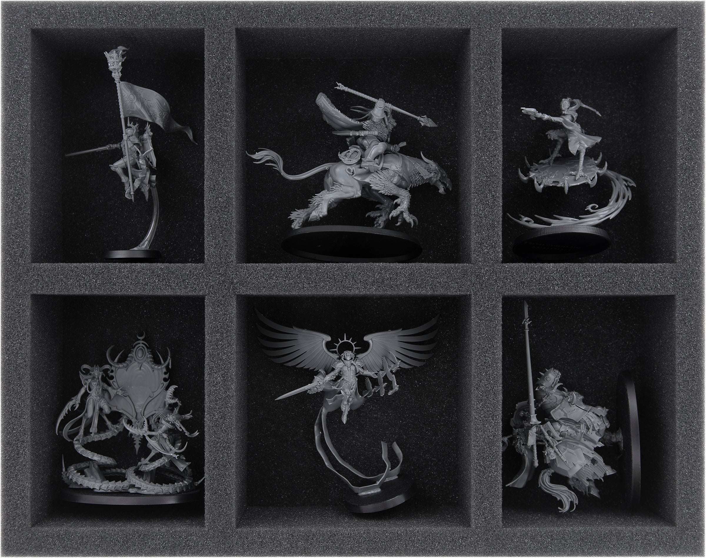 Con esta inserción de espuma, hasta 6 miniaturas más grandes pueden ser protegidas de manera óptima y regresar ilesas a la mesa. Los compartimentos de diferentes tamaños son los más adecuados para Celestine, el Santo Viviente, el Zephyrim Superior y miniaturas de tamaño similar.