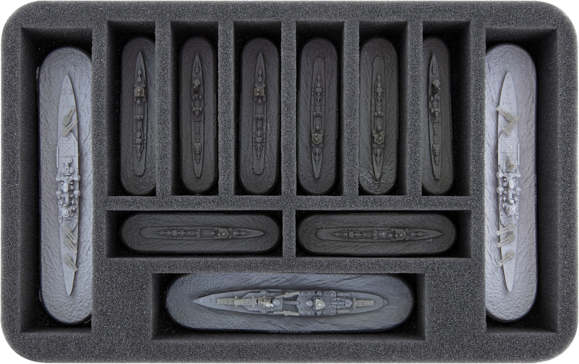 En esta bandeja de espuma Feldherr tienes espacio para hasta ocho modelos de barcos en miniatura más pequeños y tres barcos más grandes para "Victory at Sea". Por ejemplo, el inserto es particularmente adecuado para almacenar modelos con las dimensiones de los destructores más pequeños de clase Fubuki o Fletcher o barcos más grandes como el USS Indianapolis o el Kumano 1944.