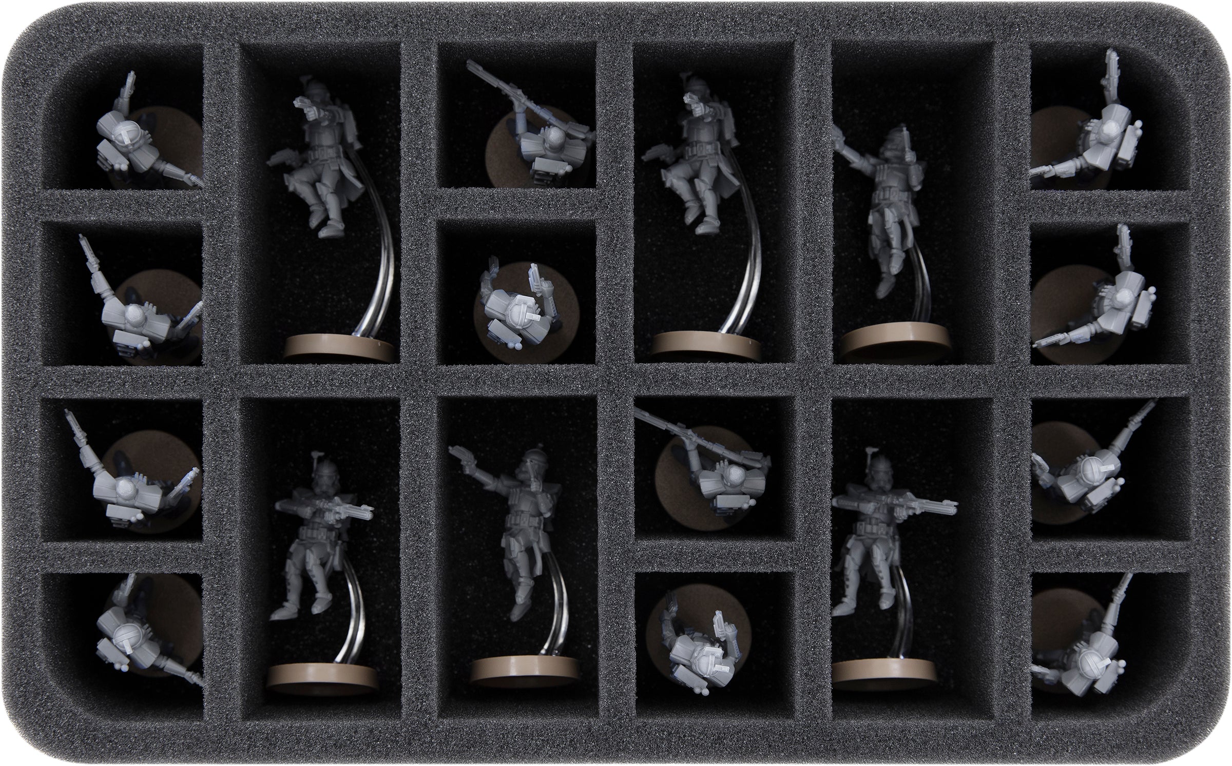 En esta bandeja de espuma Feldherr tienes espacio para un total de 18 miniaturas. La bandeja tiene 6 compartimentos alargados y 12 pequeños. Por lo tanto, es ideal para almacenar hasta 6 figuras de ARC Troopers con jetpack y soportes de vuelo. Los 12 compartimentos restantes son ideales para las unidades con dimensiones estándar.