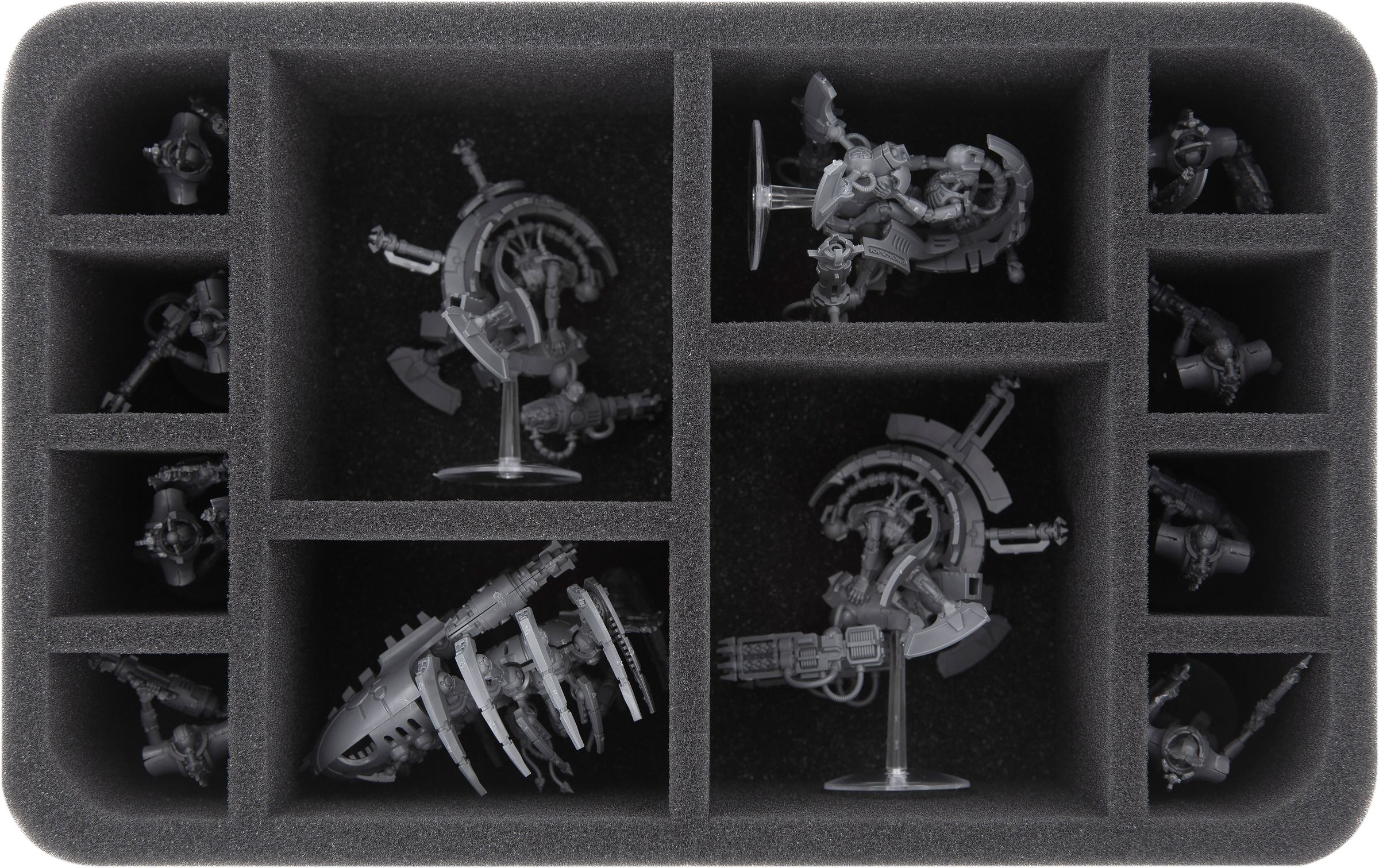 En esta bandeja de espuma Feldherr tienes espacio para hasta 12 miniaturas de tu ejército. El inserto es especialmente adecuado para guardar las cuchillas de la tumba, el Canoptek Spyder, los guerreros Necron y modelos de tamaño similar.