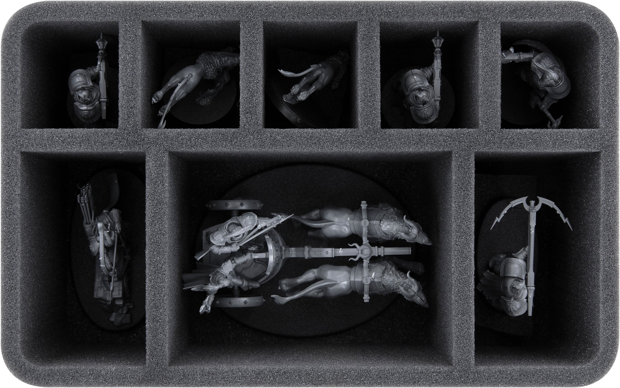 En esta bandeja de espuma Feldherr tienes espacio para hasta 8 miniaturas de tu ejército. El inserto es especialmente adecuado para guardar el Carro de la Tormenta, el Caballero-Judicador, los Sabuesos-Grifo, las Ballestas-Largas, los Cazadores-Vanguardia y modelos de tamaño similar.