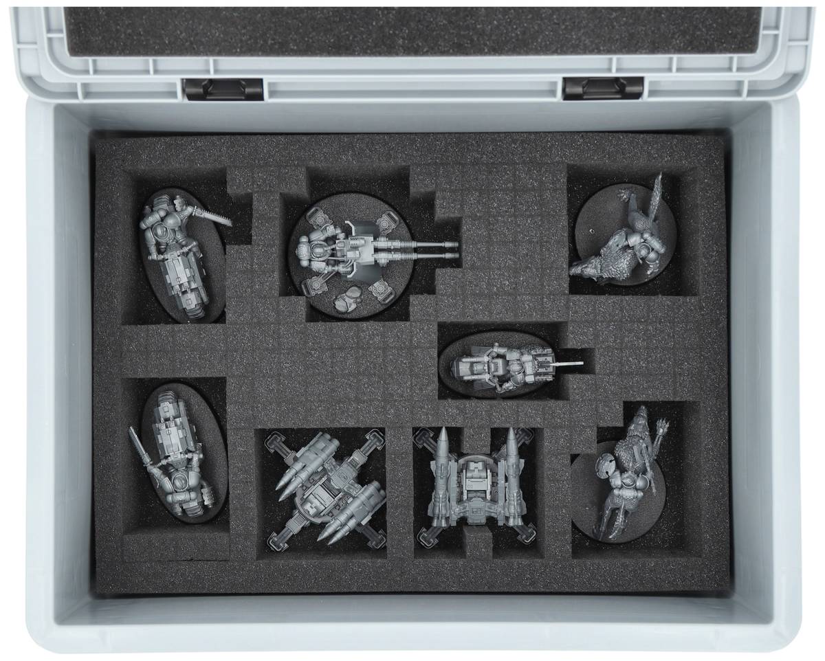 Feldherr Eurobox Set mit vier Schaumstoffeinlagen für 116 Miniaturen und zusätzlicher 60 mm Rastereinlage – schützt kleine und große Modelle sicher beim Transport