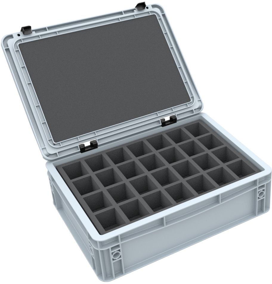 Robuste Eurobox mit zwei passgenauen Schaumstoffeinlagen für 56 Tabletop-Miniaturen - schützt deine Figuren beim Transport und hält sie ordentlich sortiert