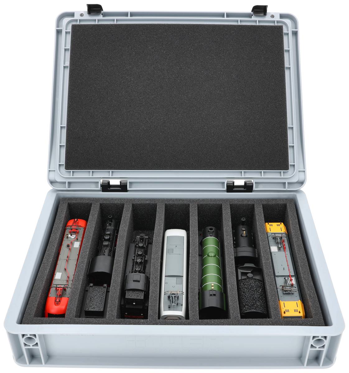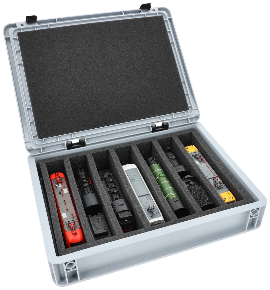 Für alle, die ihre Spur 00 Loks, Waggons und Fahrzeuge sicher und kompakt transportieren möchten: Dieses Feldherr Set kombiniert eine stapelbare Eurobox mit maßgeschneiderter Schaumstoffeinlage. Ob für die Fahrt zum Eisenbahner-Stammtisch, Modultreffen oder als platzsparende Lagerlösung daheim - deine Modelle sind jederzeit gut geschützt.