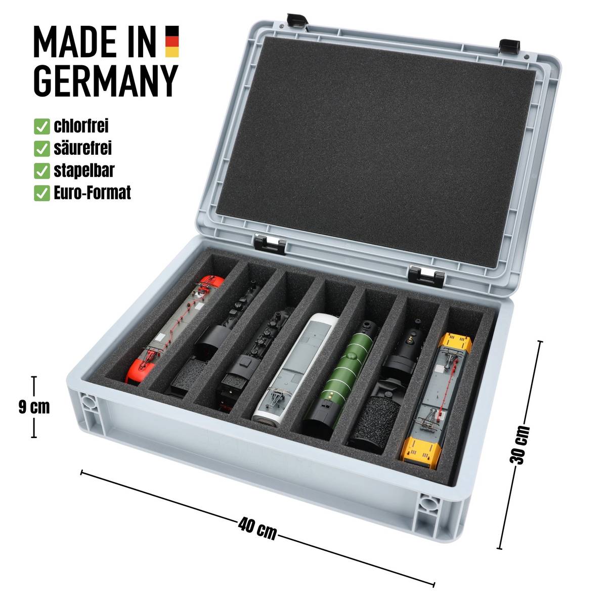 Robuste Eurobox 40 x 30 cm mit Schaumstoffeinlage (7 Fächer) für Spur 00 Modelle - ideal für den sicheren Transport und die stehende Aufbewahrung von Loks und Waggons