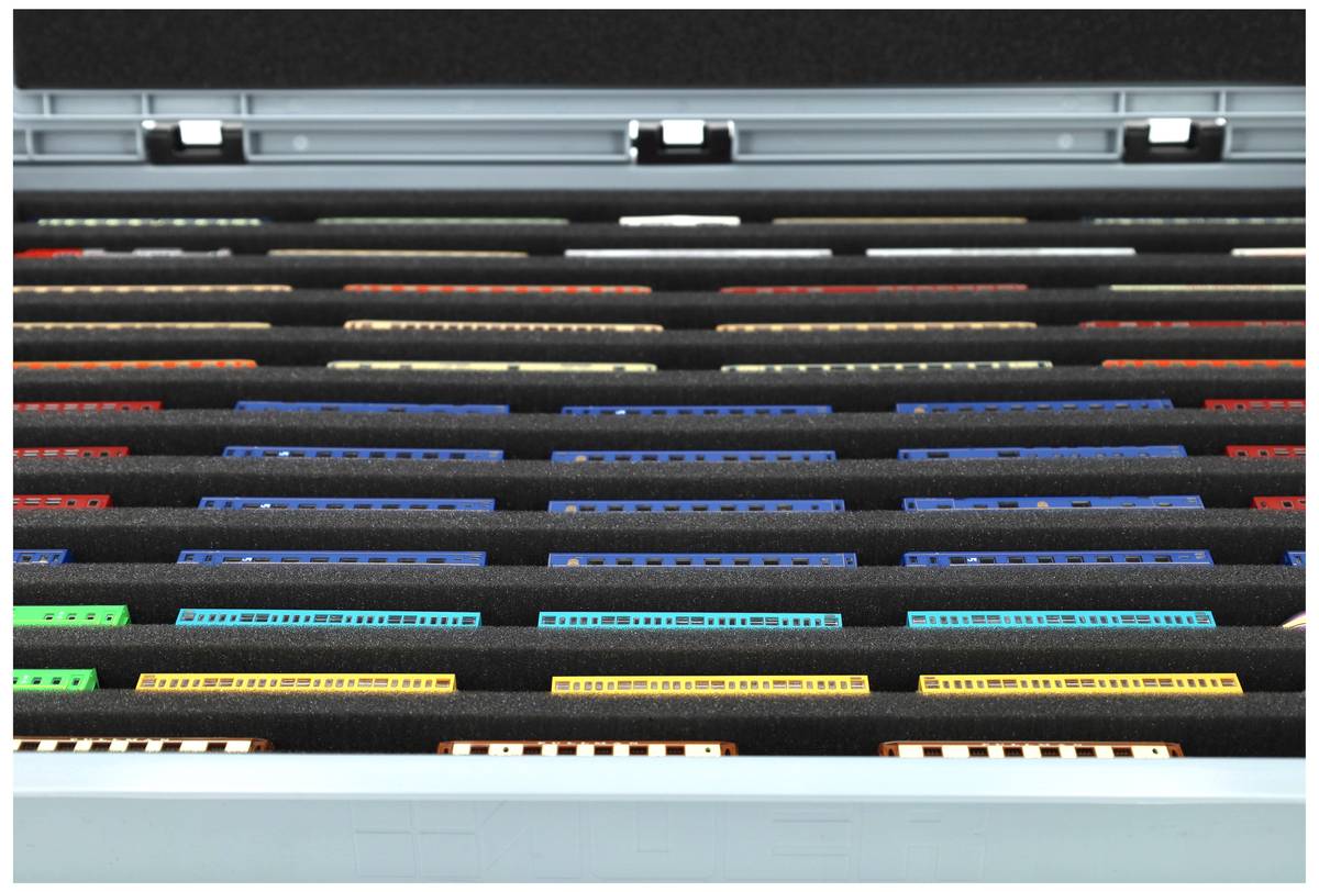 Die 12 gleich großen Fächer (je ca. 550 x 20 x 20 mm) sind speziell für Modelle der Spur Z ausgelegt. Durch die liegende Lagerung bleiben empfindliche Bauteile und Pantografen sicher geschützt, während die Modelle stabil und vibrationsfrei transportiert werden.