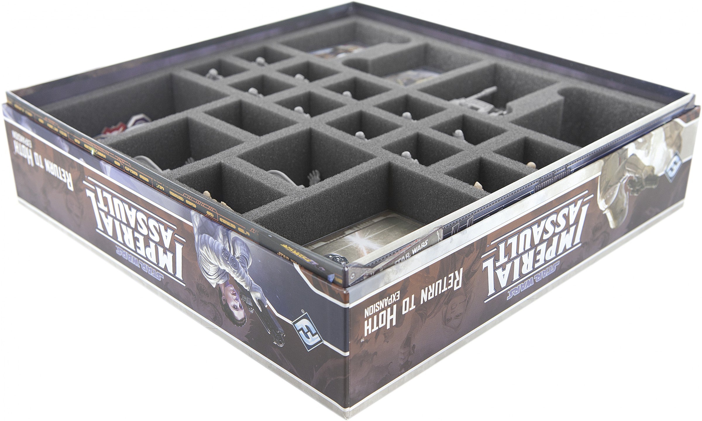 Plateau en mousse spécialement conçu pour Star Wars Imperial Assault - Return To Hoth. Les 22 fentes de différentes tailles conviennent à tous les matériaux de jeu imaginables. 10 mm de mousse en plus sont inclus.