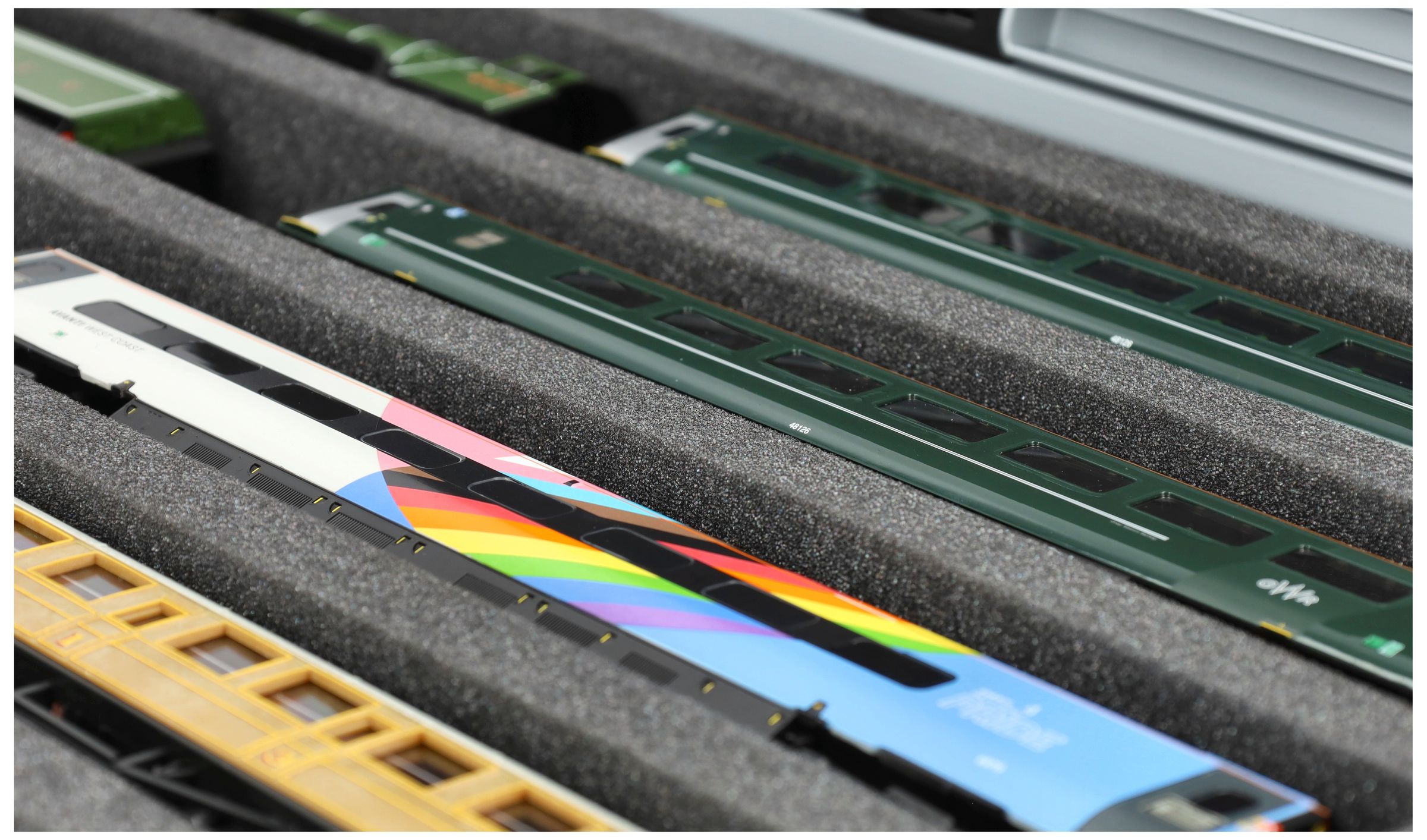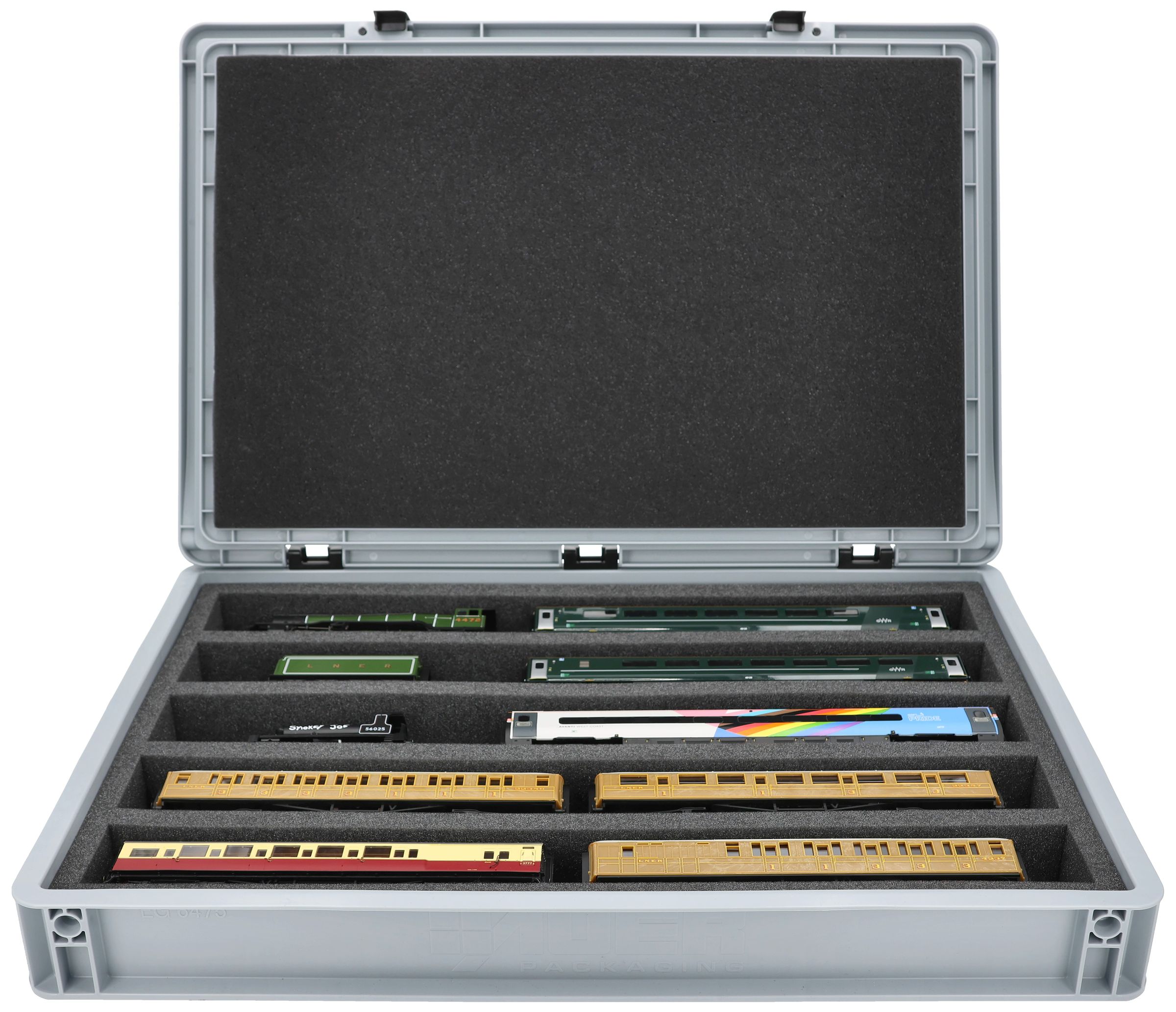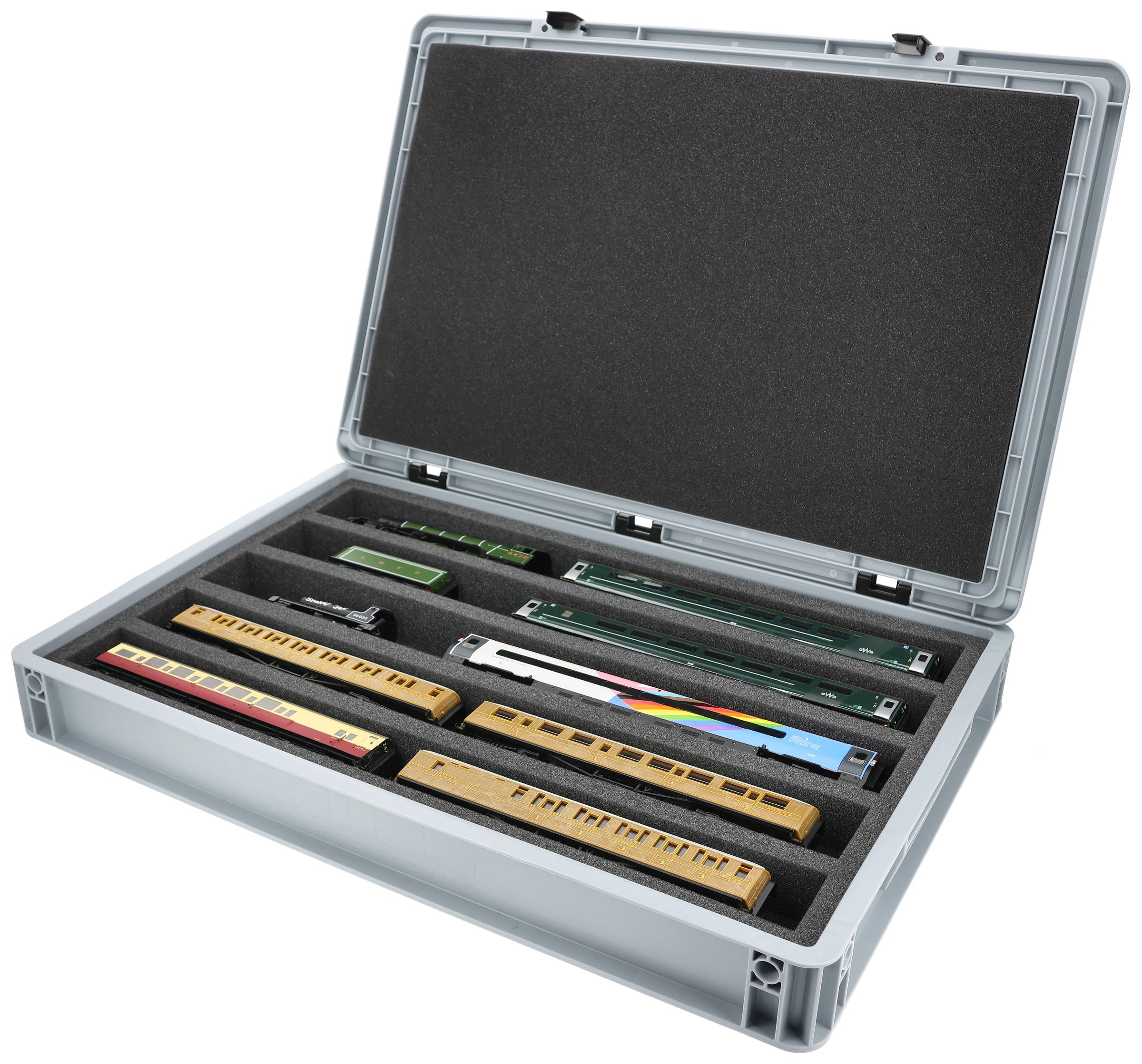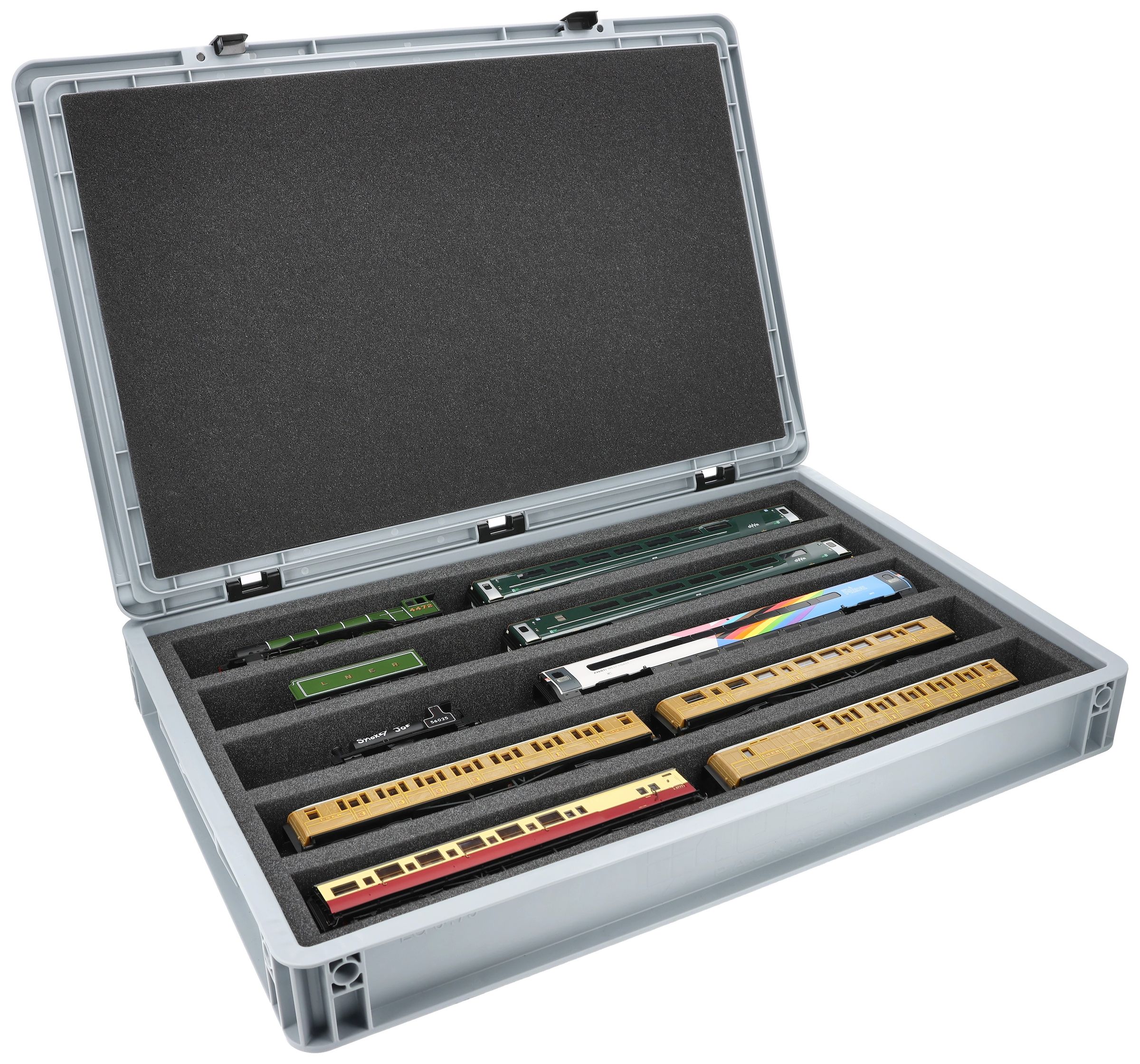 Les 5 compartiments de taille égale (environ 550 x 55 x 40 mm chacun) sont spécialement conçus pour les modèles à l'échelle 00. Grâce à la longueur des compartiments, les locomotives et les wagons peuvent être placés côte à côte. L'ajustement exact garantit que les modèles sont solidement fixés et ne glissent pas pendant le transport.
