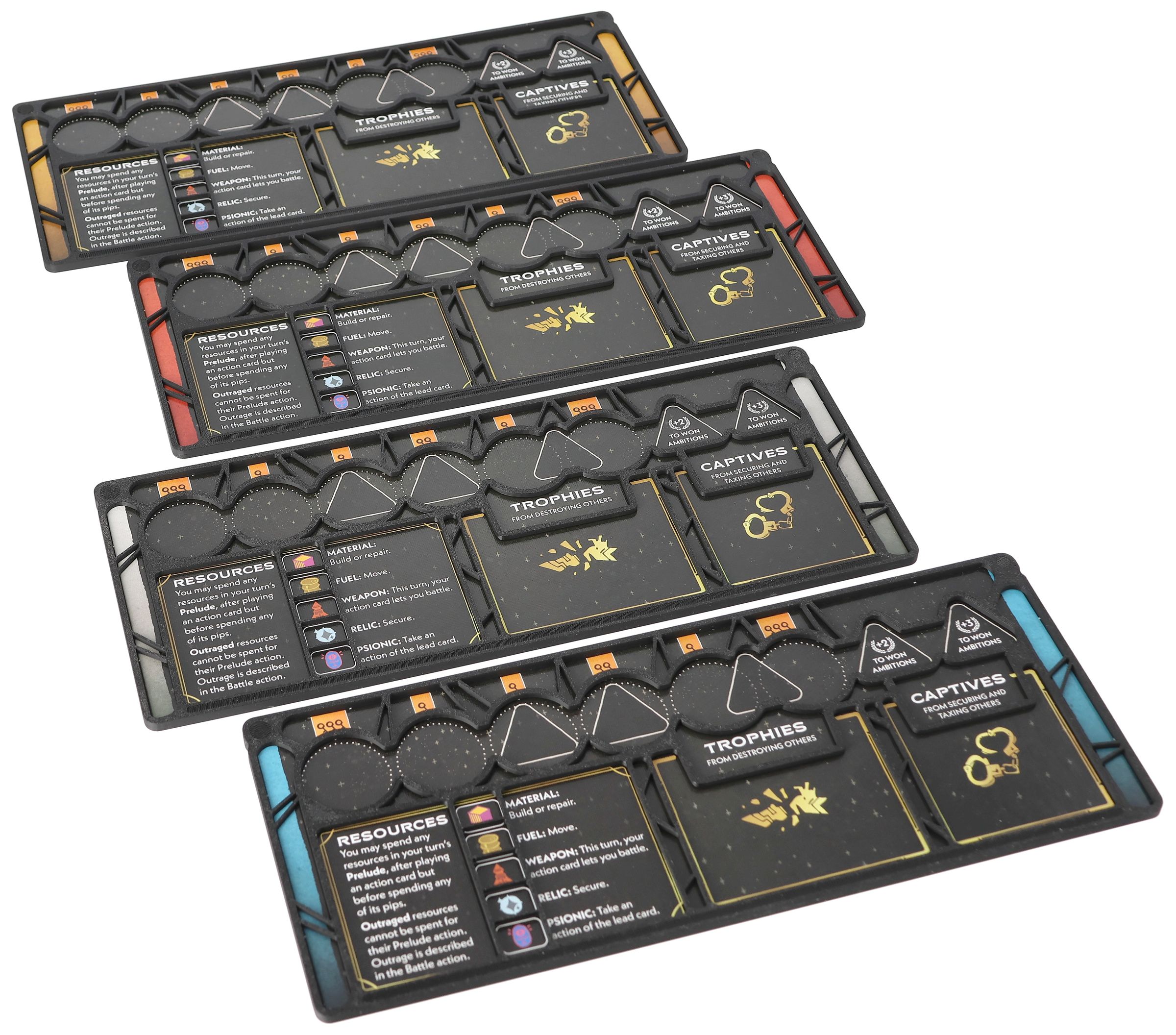 • Chaque joueur reçoit son propre plateau à sa couleur, qui peut être fixé directement sur le cadre du plateau de jeu - pour un rangement et un accès rapide au matériel de jeu personnel.