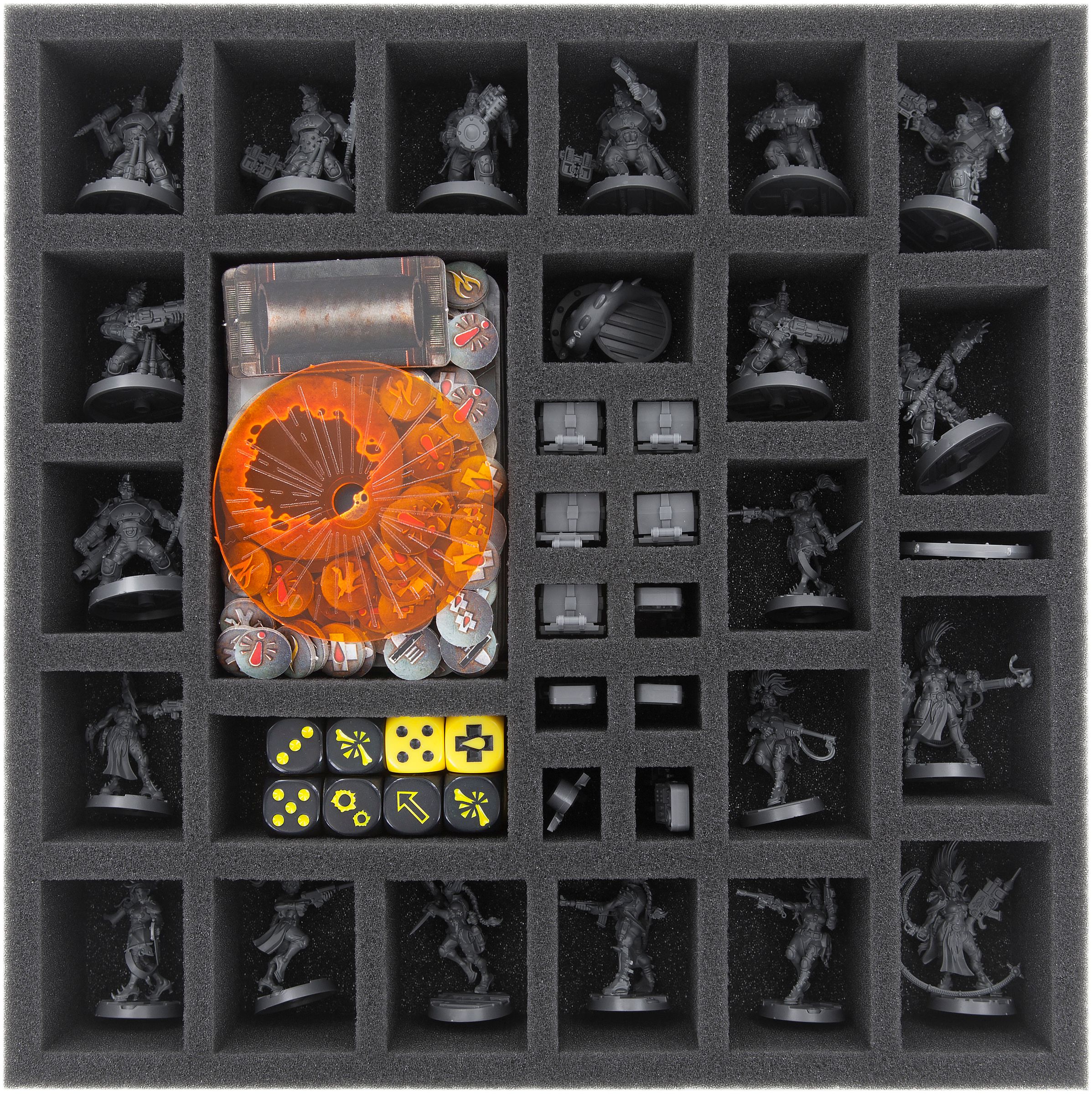Ce plateau en mousse Feldherr dispose de 34 compartiments pour le rangement sûr et ordonné du matériel de jeu "Necromunda". La mousse à pores fins offre une protection fiable contre les dommages - les pièces fragiles restent intactes, la couleur des modèles peints reste intacte, les surfaces des jetons et des dés ne sont pas rayés.