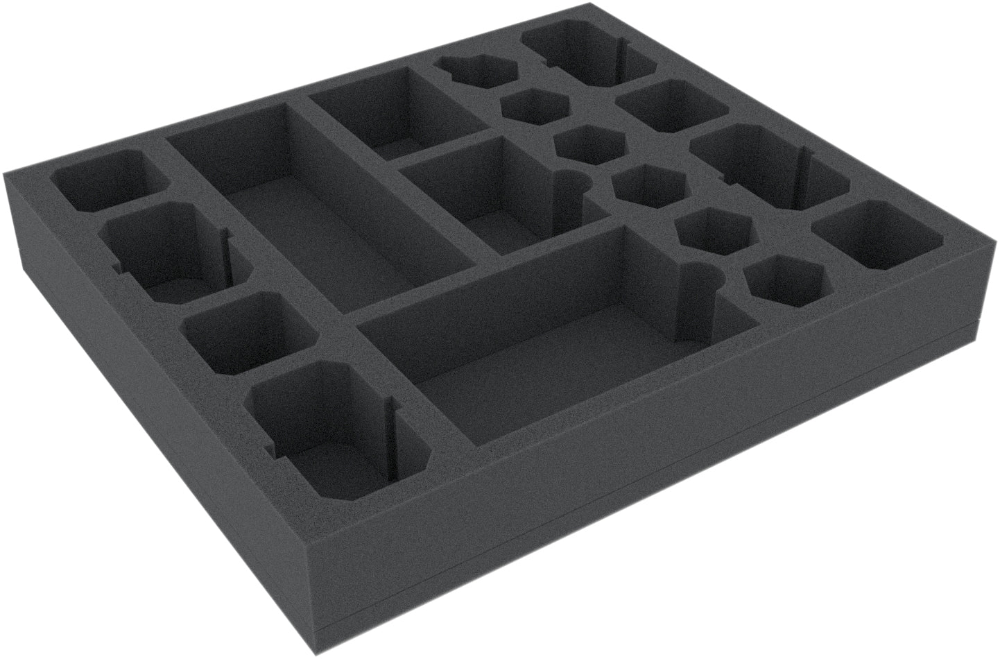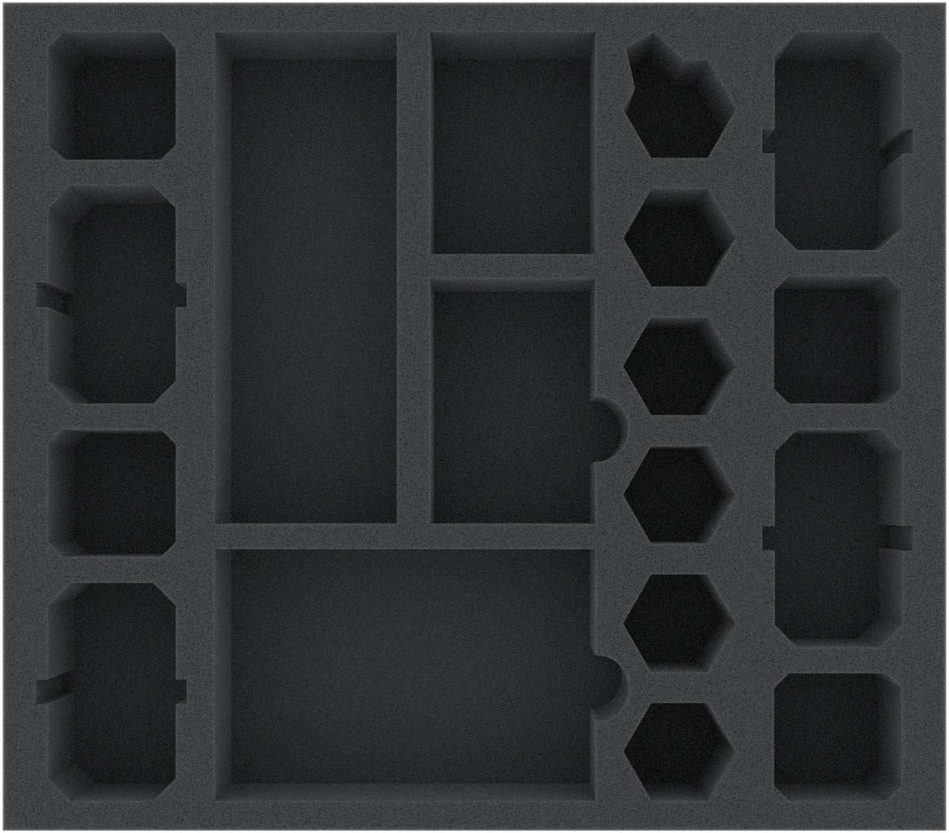 Plateau en mousse avec 18 compartiments pour ranger clairement le matériel de jeu (dés et cartes) et les pièces de construction. Convient pour l'Adeptus Titanicus original : Boîte de jeu de plateau Grandmaster Edition.
