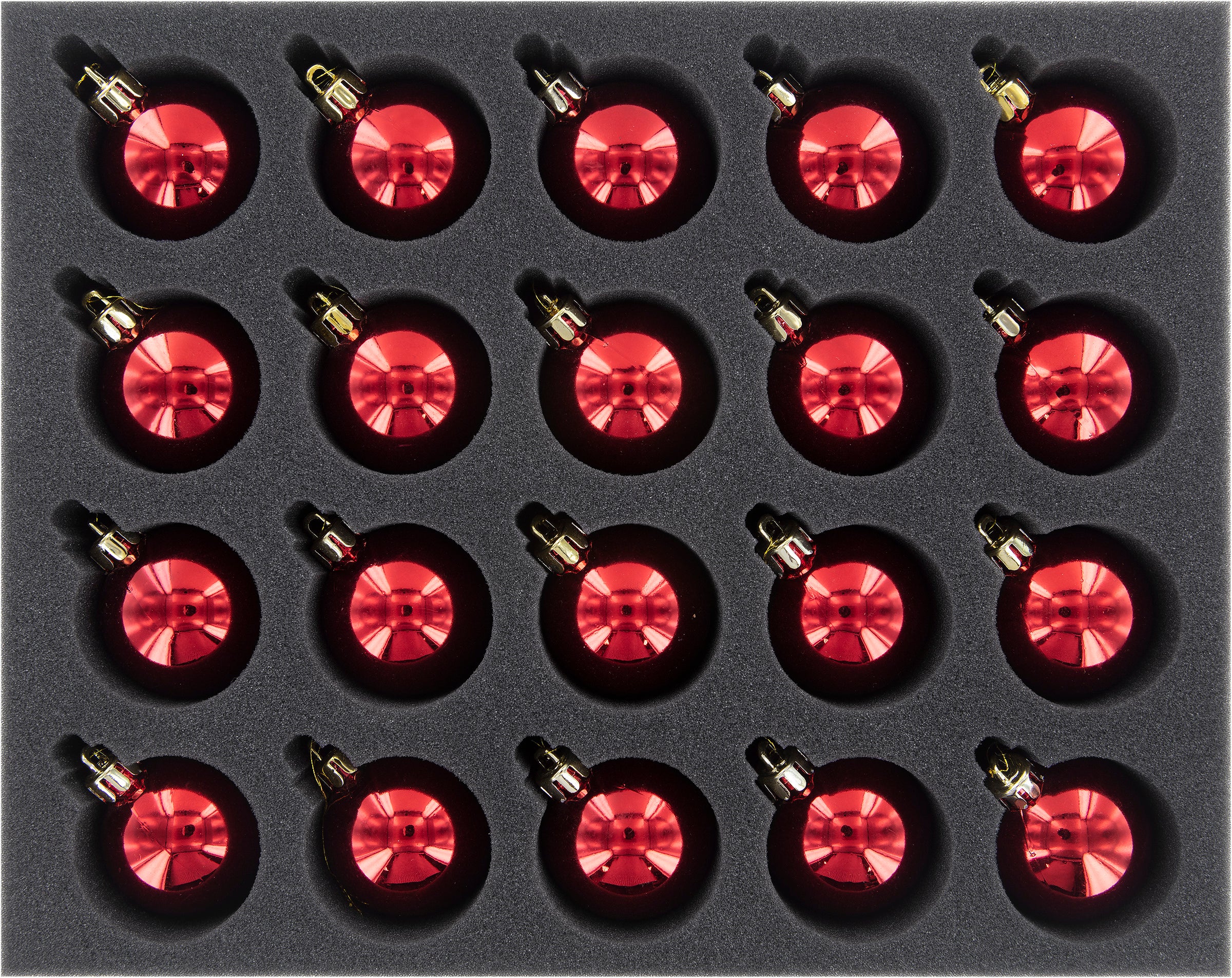 Le même problème de boules de Noël que chaque année ? En utilisant les plateaux en mousse Feldherr, les boules décoratives sensibles survivent au stockage et au transport sans être endommagées. 20 boules d'un diamètre de 50 mm chacune trouvent leur place dans la mousse souple. Même en cas de chute d'une grande hauteur, elles survivront sans problème. La prudence est donc toujours de mise lorsqu'il s'agit de les suspendre et de les retirer.