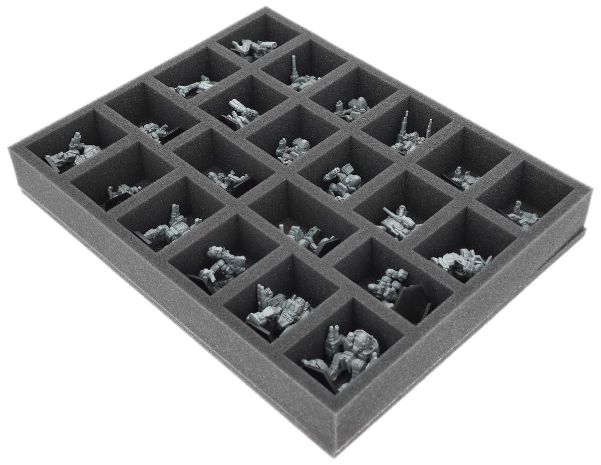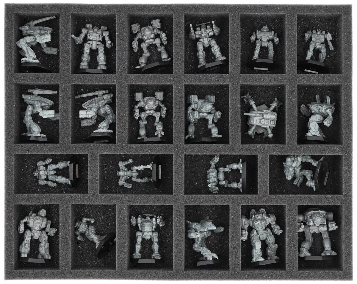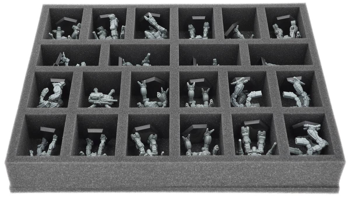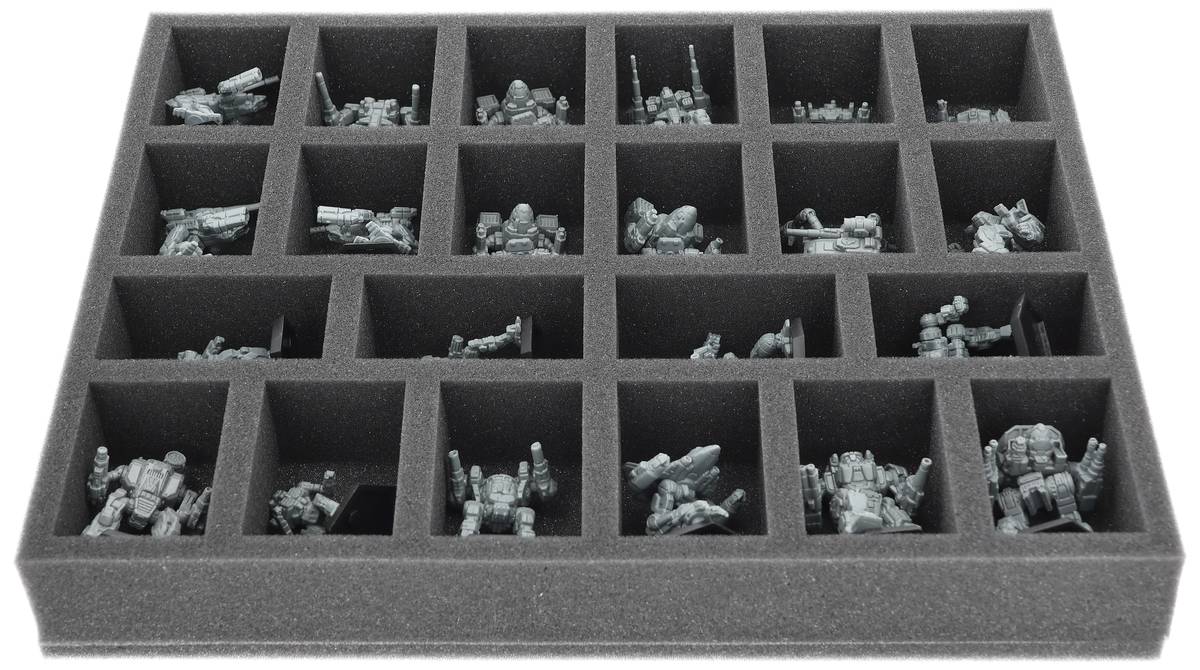 Diese Schaumstoffeinlage eignet sich mit ihren 22 unterschiedlich großen Fächern hervorragend um deine BattleTech-Miniaturen übersichtlich und bestens geschützt aufzubewahren.