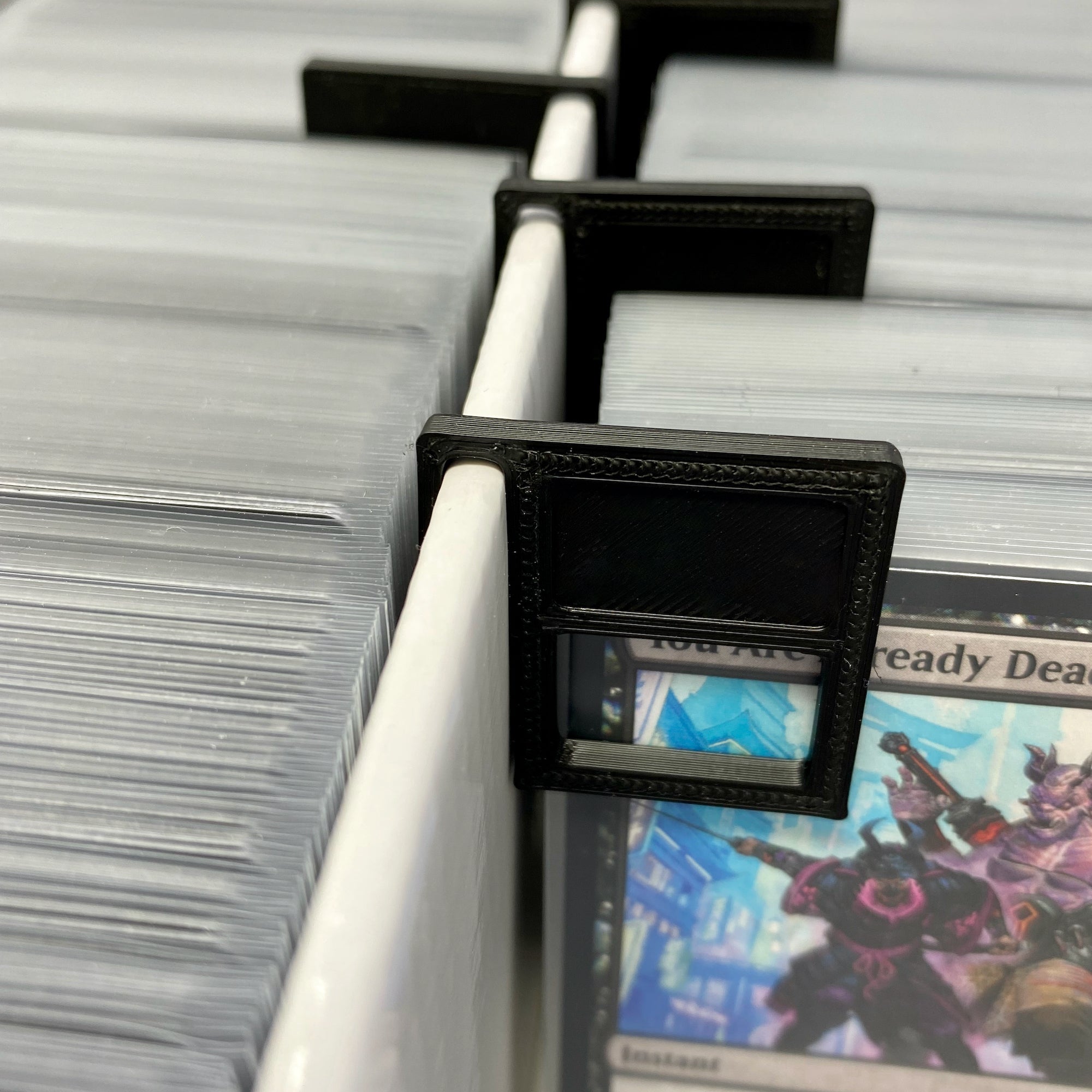 Il Divider Clip si aggancia semplicemente alla parete divisoria centrale della scatola del mazzo di carte, fungendo da divisorio flessibile per separare le carte da gioco e quelle collezionabili.