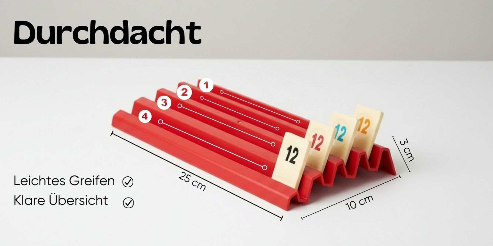 Con i suoi 25 cm di lunghezza, il supporto offre molto spazio per disporre le piastrelle senza sentirsi affollati. Realizzato in plastica di alta qualità stampata a iniezione, è estremamente resistente, stabile e costruito per durare a lungo. Nonostante la sua robustezza, rimane leggero e maneggevole. Le ampie fessure rendono comoda la presa e il riposizionamento delle tessere, anche per i giocatori con dita più grandi o meno flessibili.