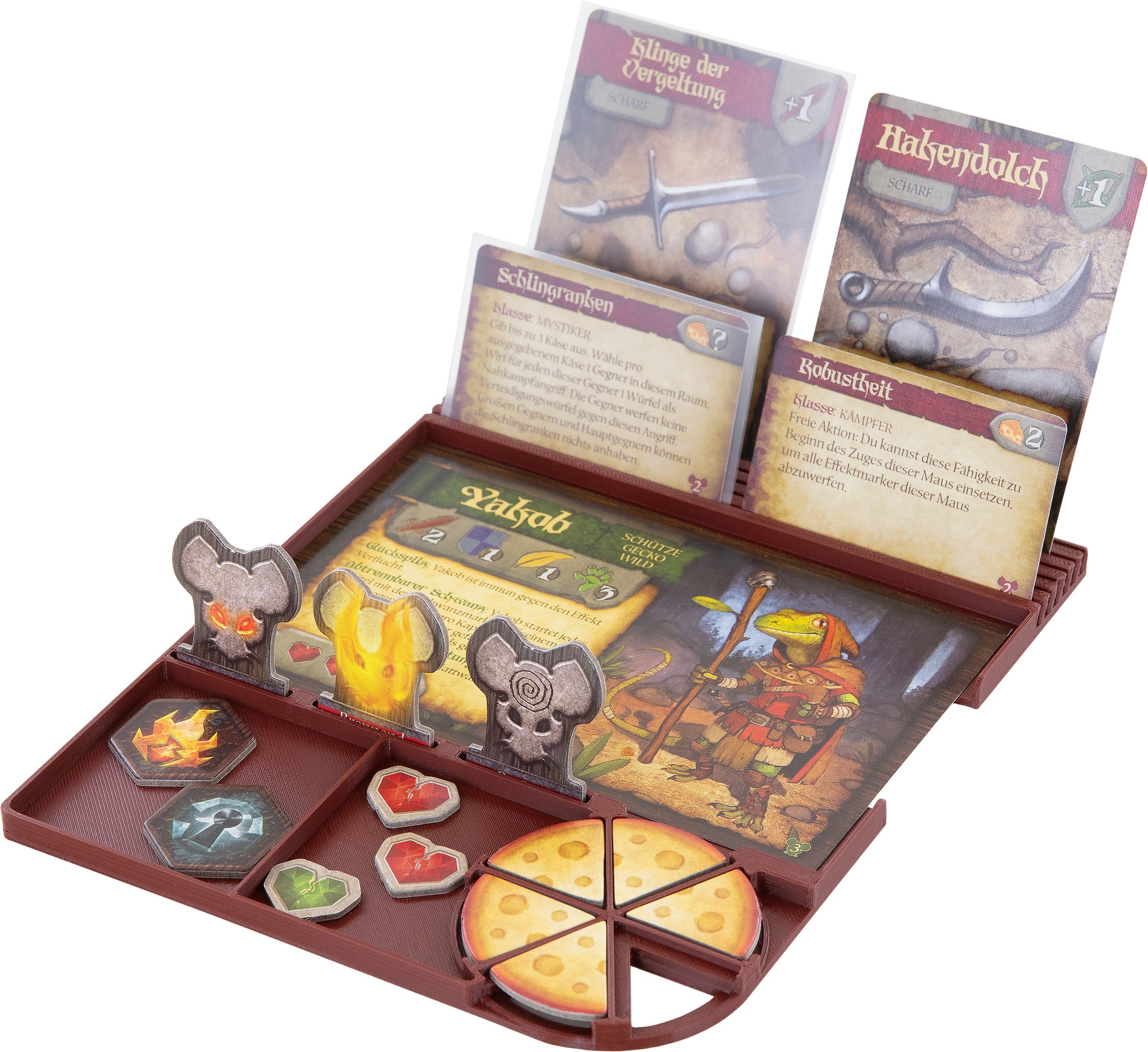 - Sono disponibili 6 slot per un totale di 12 carte. 1 grande compartimento serve per conservare il tuo Foglio dell'Eroe. Fino a 3 slot sono disponibili per i segnalini Effetti Negativi. Puoi riempire 3 scomparti con i gettoni, con lo scomparto rotondo ideale per i gettoni del formaggio.