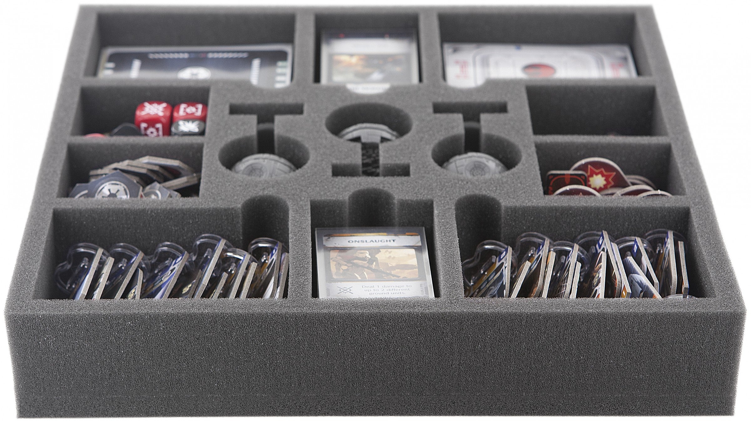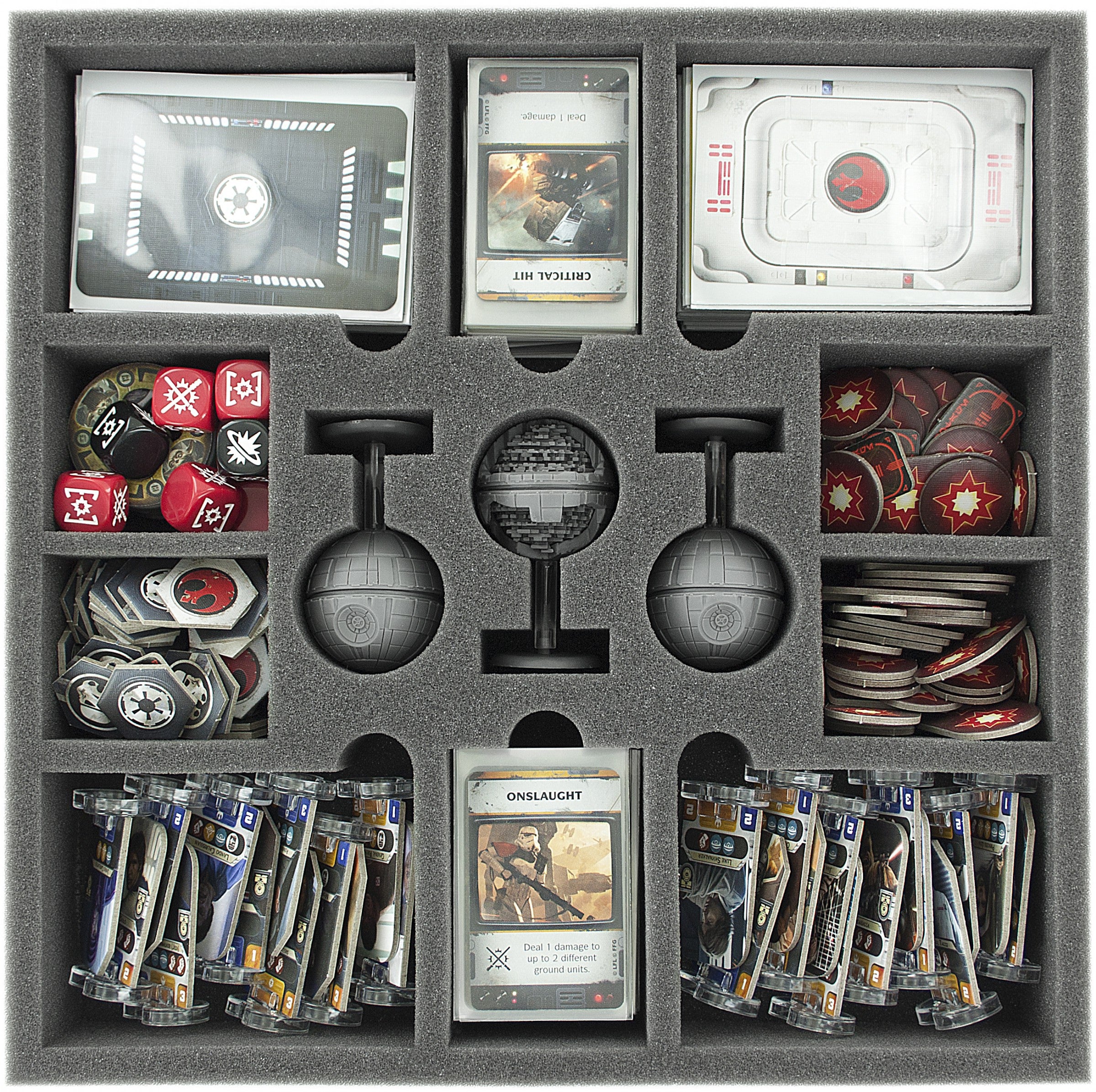 Vassoio in schiuma speciale per Star Wars Rebellion. I 13 scomparti di diverse dimensioni sono per 3 Stelle della Morte, Token, carte in maniche e i leader.