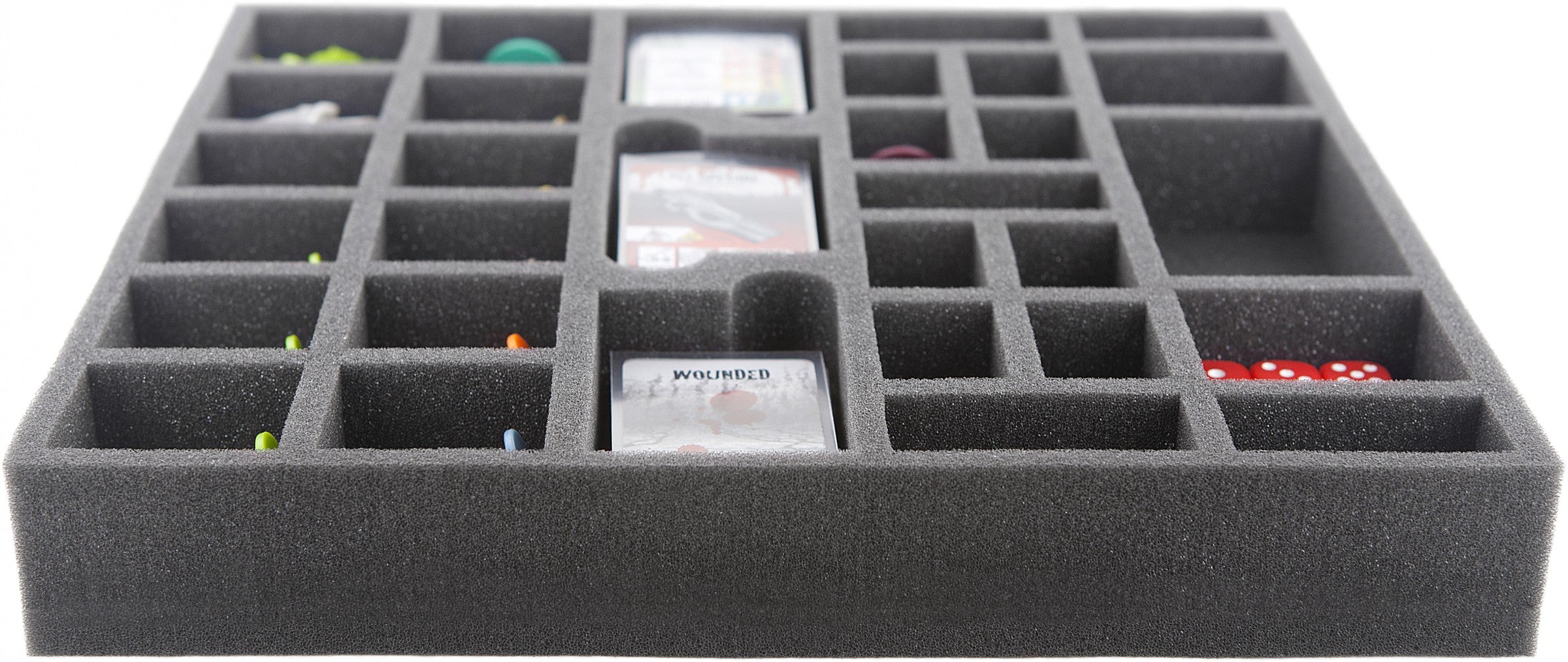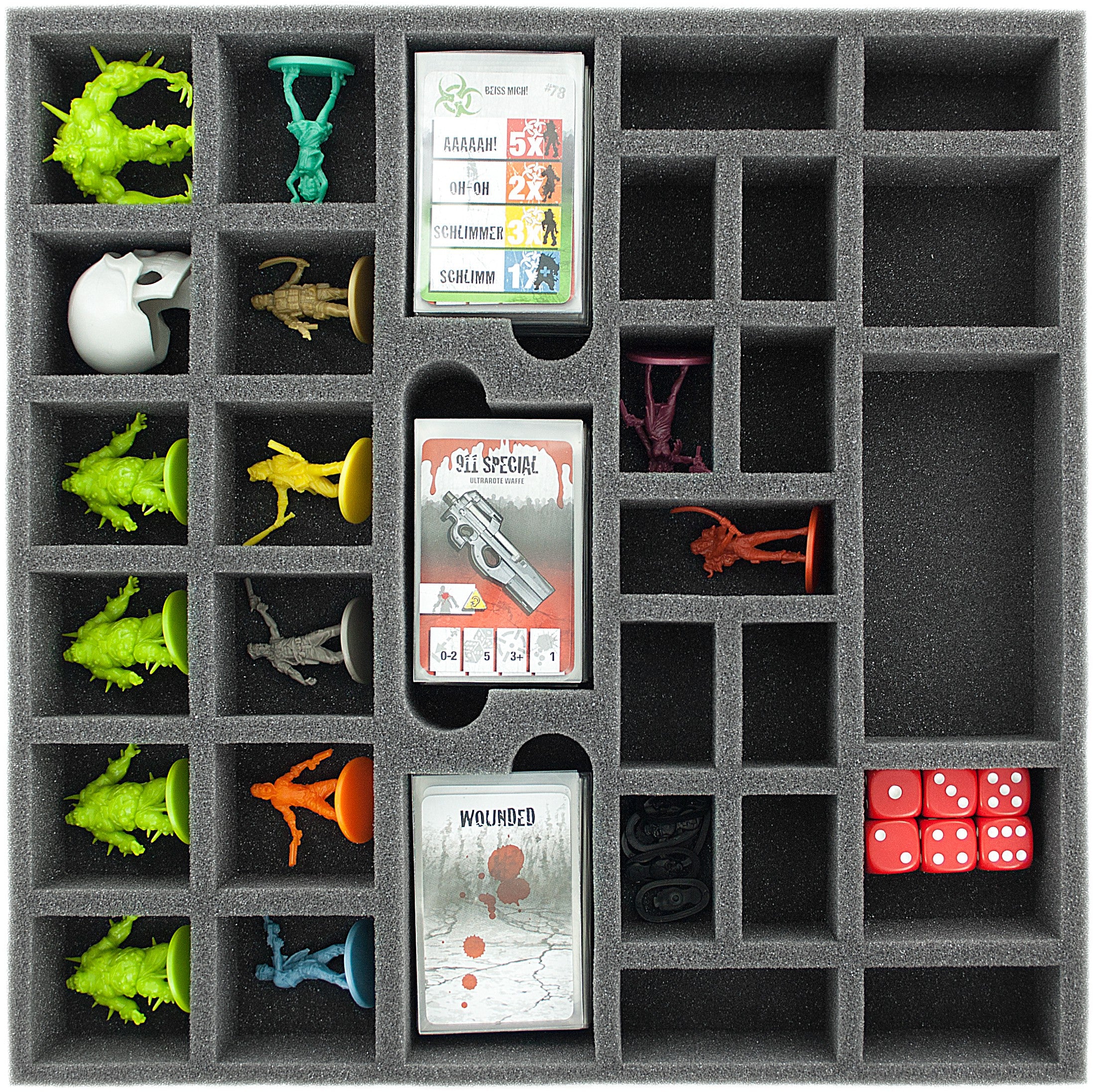 - 3 slot per Mini Card nelle maniche (carte Zombie, carte Equipaggiamento e carte Wounded) - dimensioni dello scomparto 78 mm x 52 mm x 52 mm x 31 mm di altezza