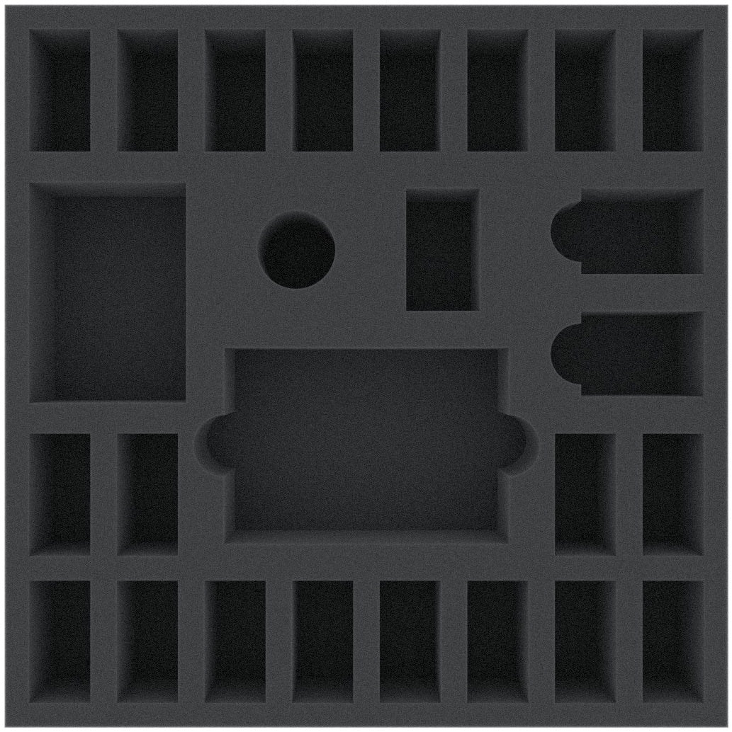 This 50 mm mm high foam tray is divided into 26 compartments. It is particularly suitable for the safe storage of tabletop and board game miniatures, as well as other fragile models and small parts.