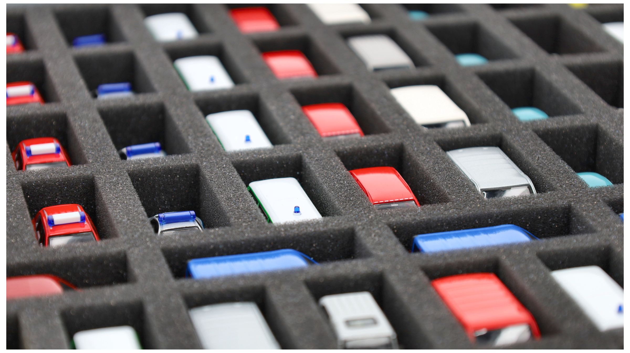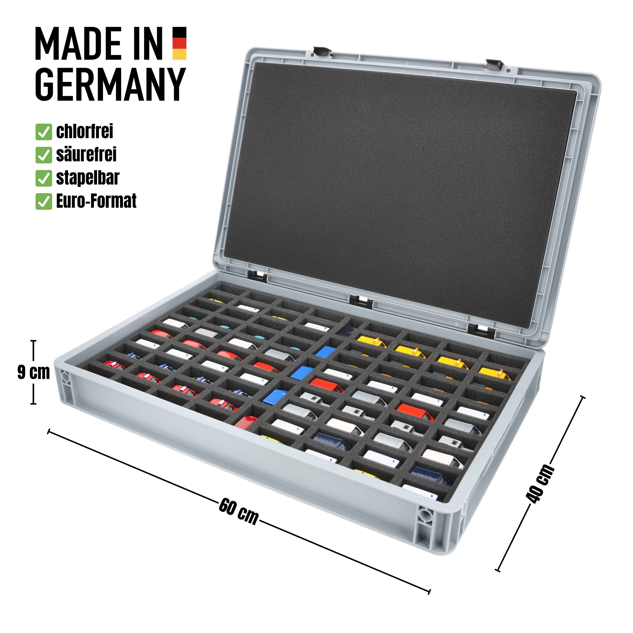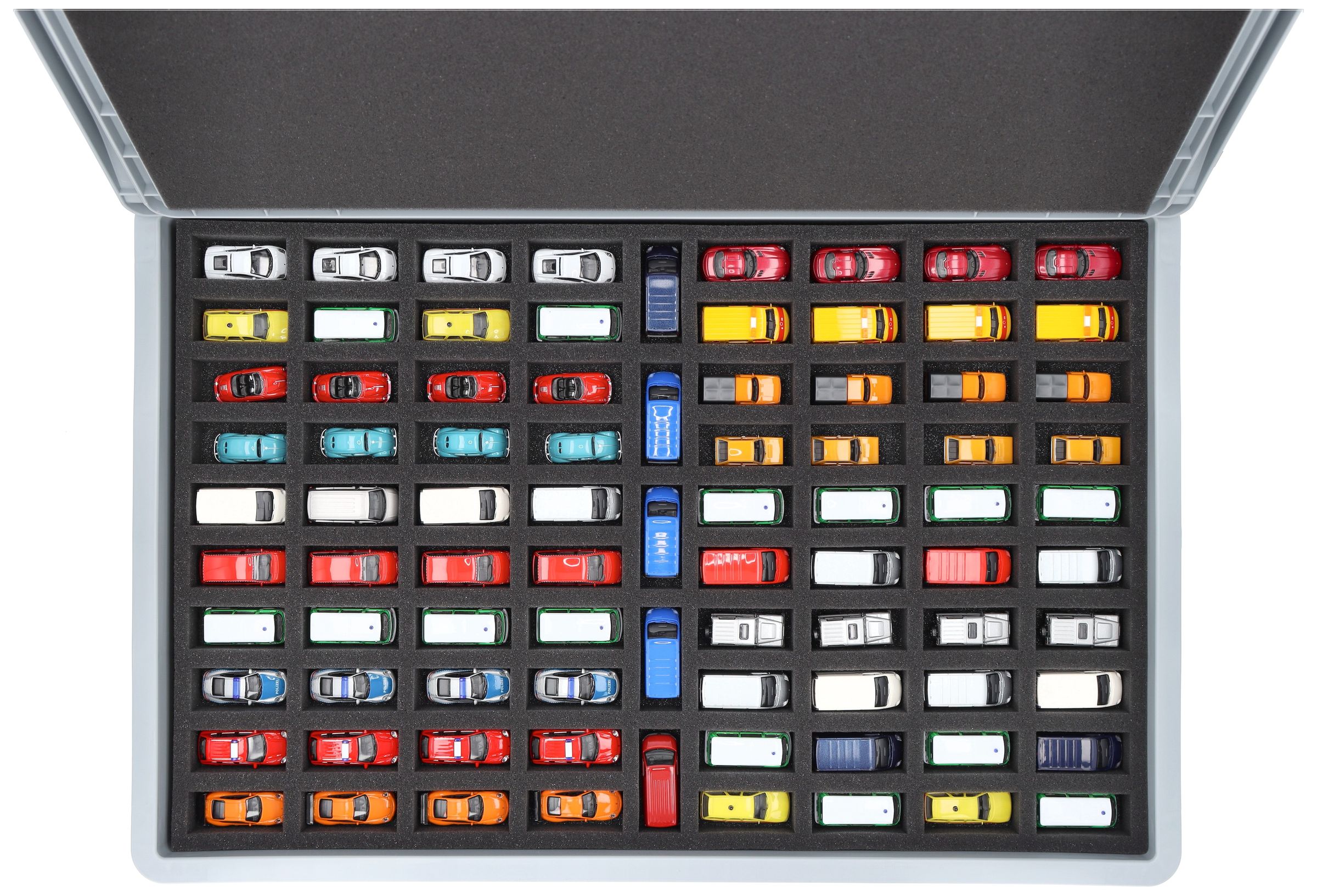 - Inserto in schiuma di precisione con 85 scomparti per veicoli in scala 1:87 - 80 scomparti ca. 56 x 25 x 25 mm + 5 scomparti ca. 61 x 25 x 25 mm