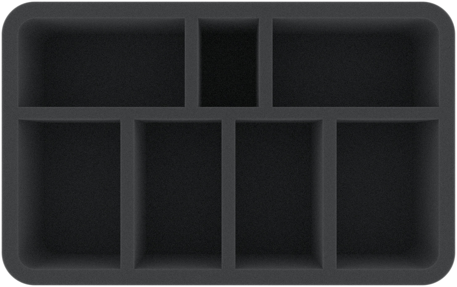 This 80 mm mm high foam tray is divided into 7 compartments. It is particularly suitable for the safe storage of tabletop and board game miniatures, as well as other fragile models and small parts.