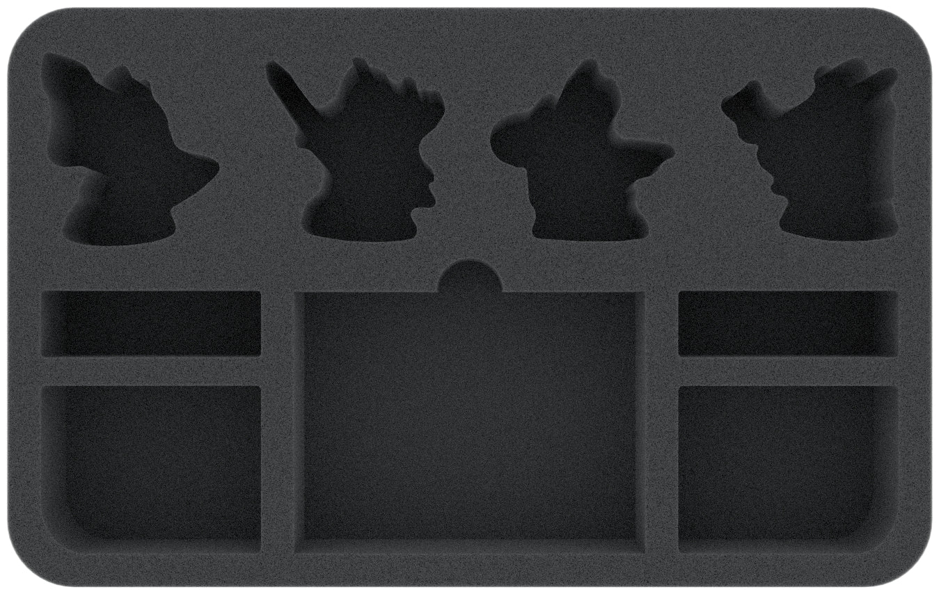 Ai quattro Slaves to Darkness sono assegnati compartimenti tagliati con precisione in miniatura qui. Khagra, Zarshia Bittersoul, Razek Godblessed e Dour Cragan sono al sicuro nella schiuma morbida, e quindi preparati al meglio per il trasporto sul tavolo. La mazza, il bastone e tutti gli altri dettagli sensibili rimangono intatti e sono pronti all'uso in qualsiasi momento.