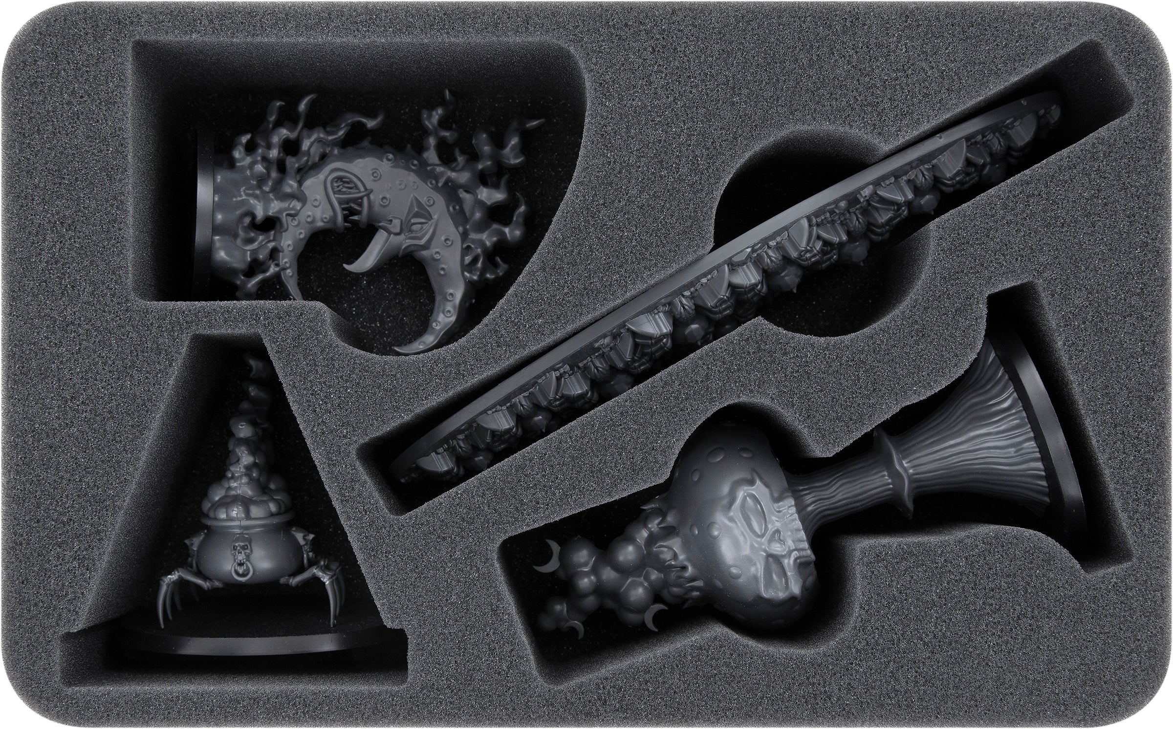 Tutti e quattro i modelli dei tuoi Incantesimi Infiniti ottengono il proprio scomparto in miniatura tagliato con precisione. Questo assicura che non si urtino tra loro e non si danneggino durante il trasporto. Se hai dipinto le tue miniature, saranno risparmiate da graffi e scheggiature.