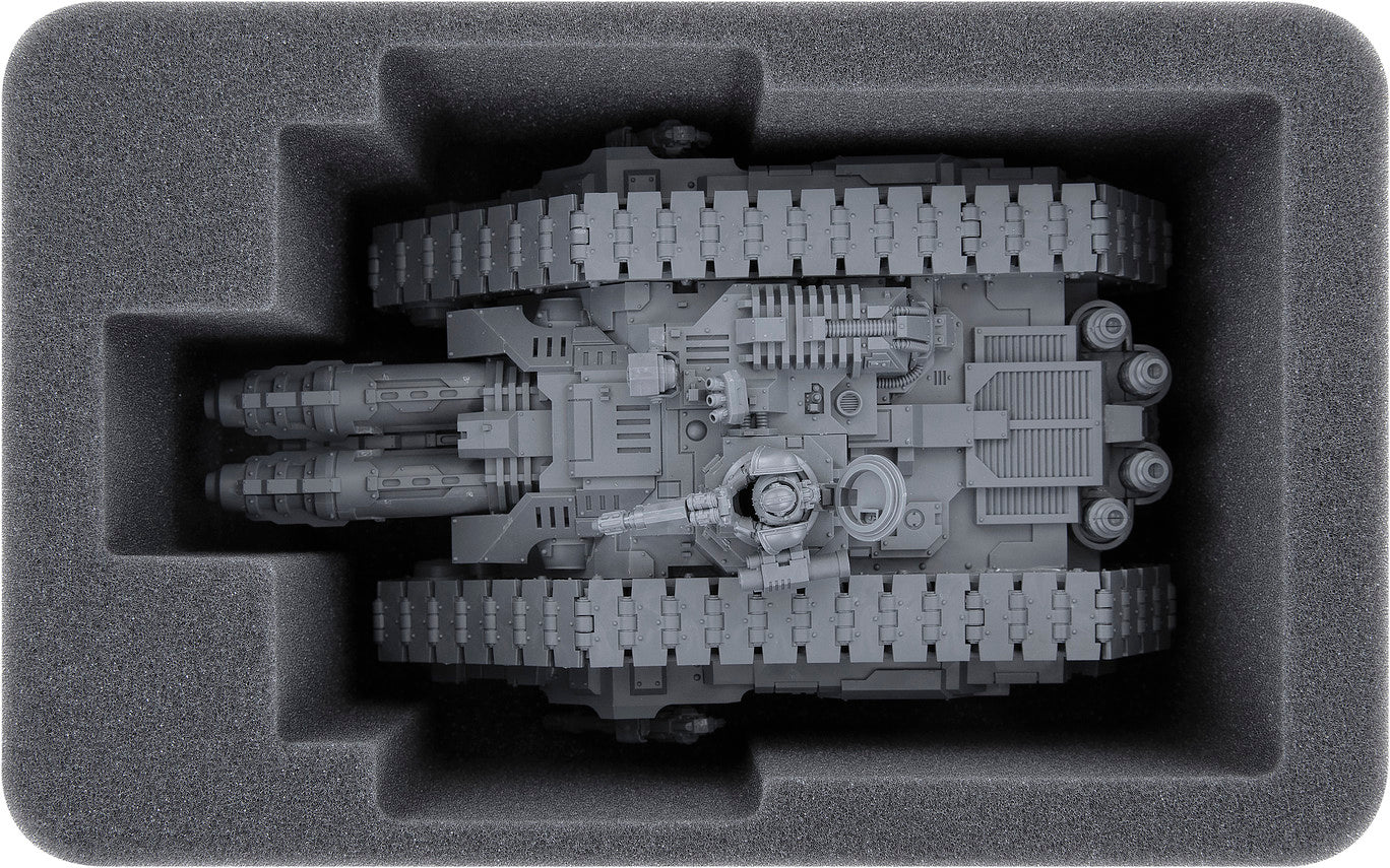 Affinché l'elaborato modello in resina arrivi sul campo di battaglia senza danni, abbiamo creato un Feldherr Vassoio per schuma adatto con. L'ampio compartimento personalizzato offre una protezione ottimale per il Cerberus Heavy Tank Destroyer.