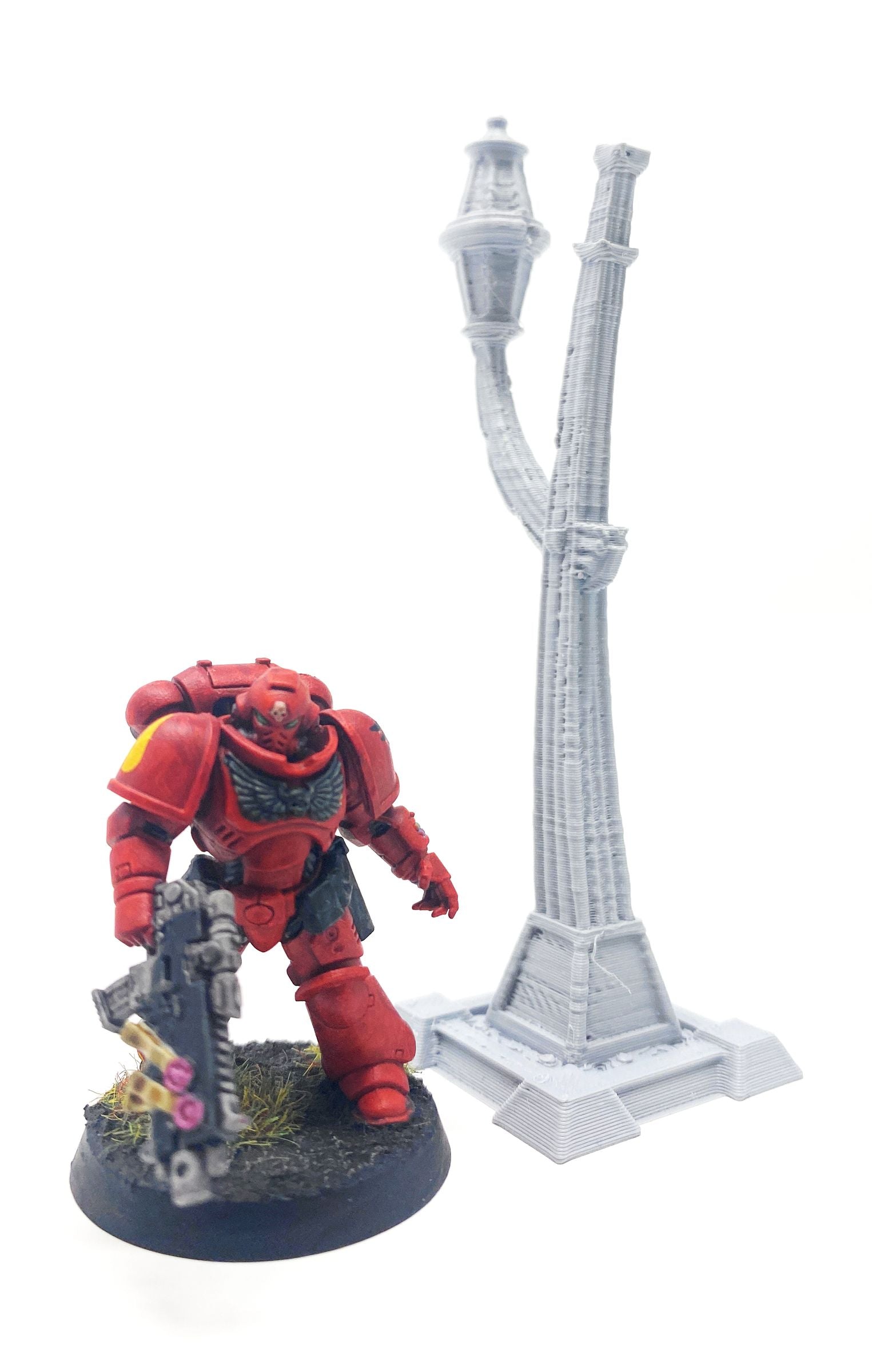 The street light stands 100 mm tall. The Red Space Marine on 32 mm base is for size comparison only. It it is not part of the set.