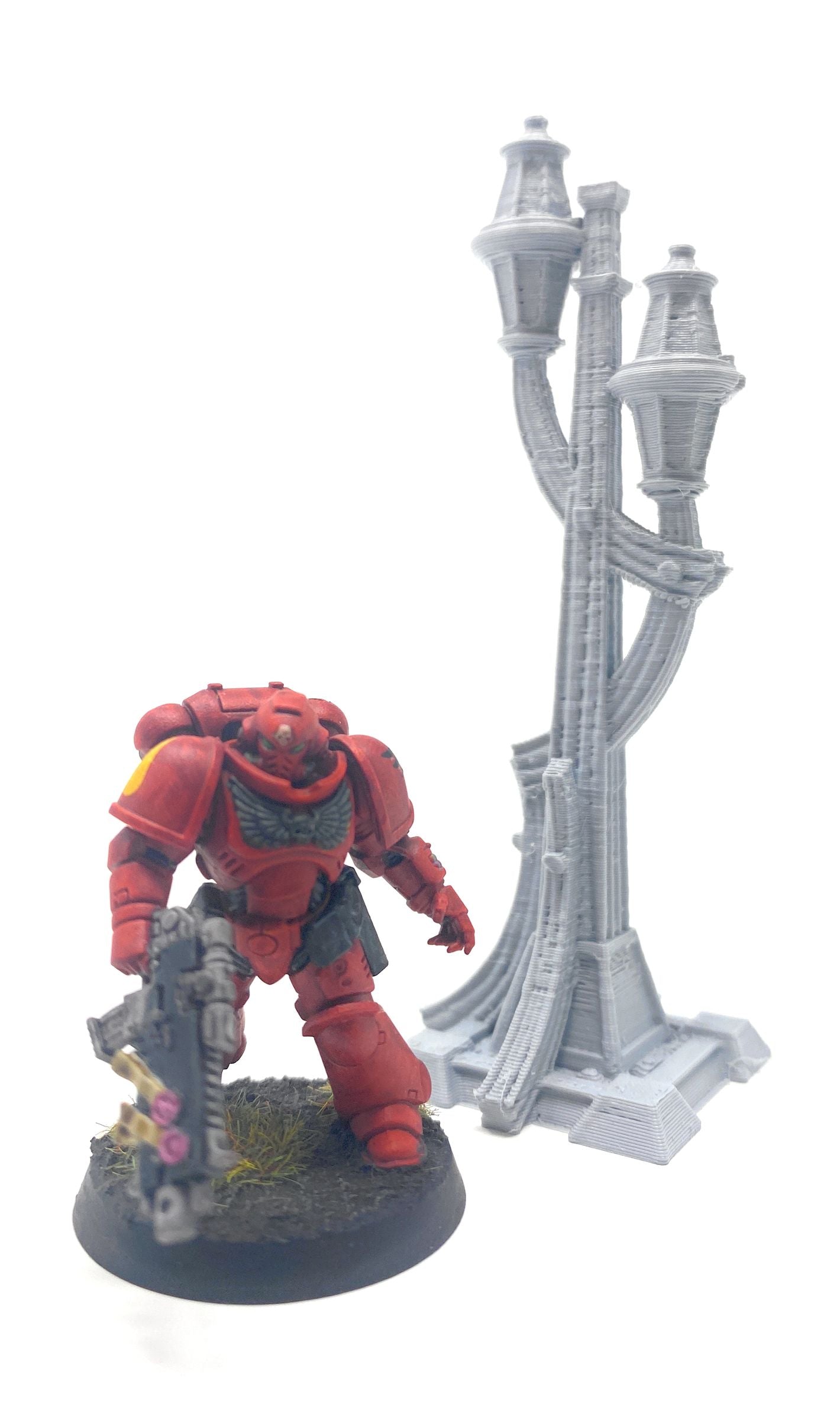 The street light stands 100 mm tall. The Red Space Marine on 32 mm base is for size comparison only. It it is not part of the set.
