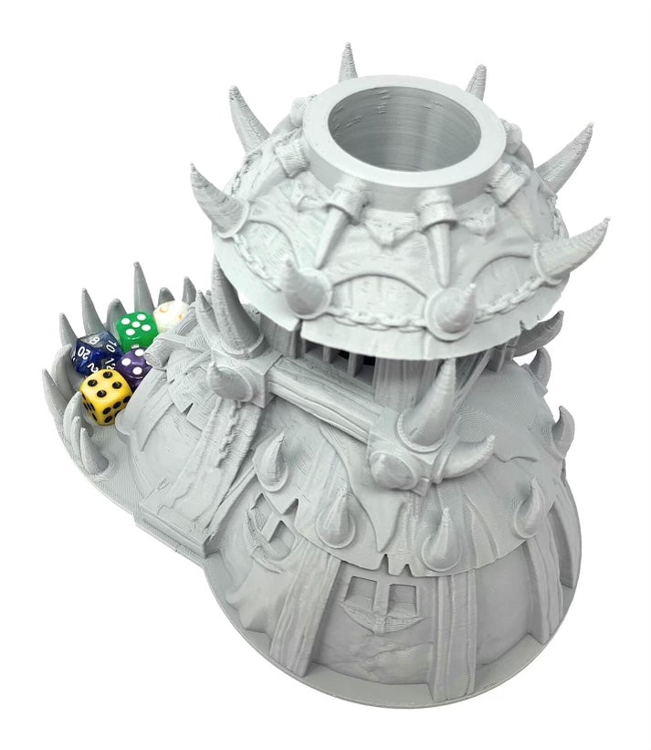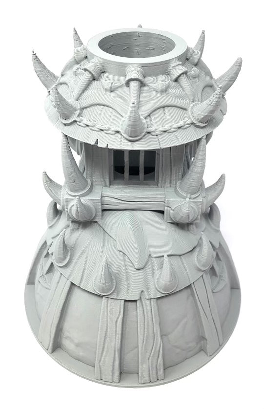 3D printed - detailed dice tower, with removable roof and exchangeable dice tray. The Dice Tower can also be used as a terrain part for your miniatures game or as a center piece for your next DnD session.