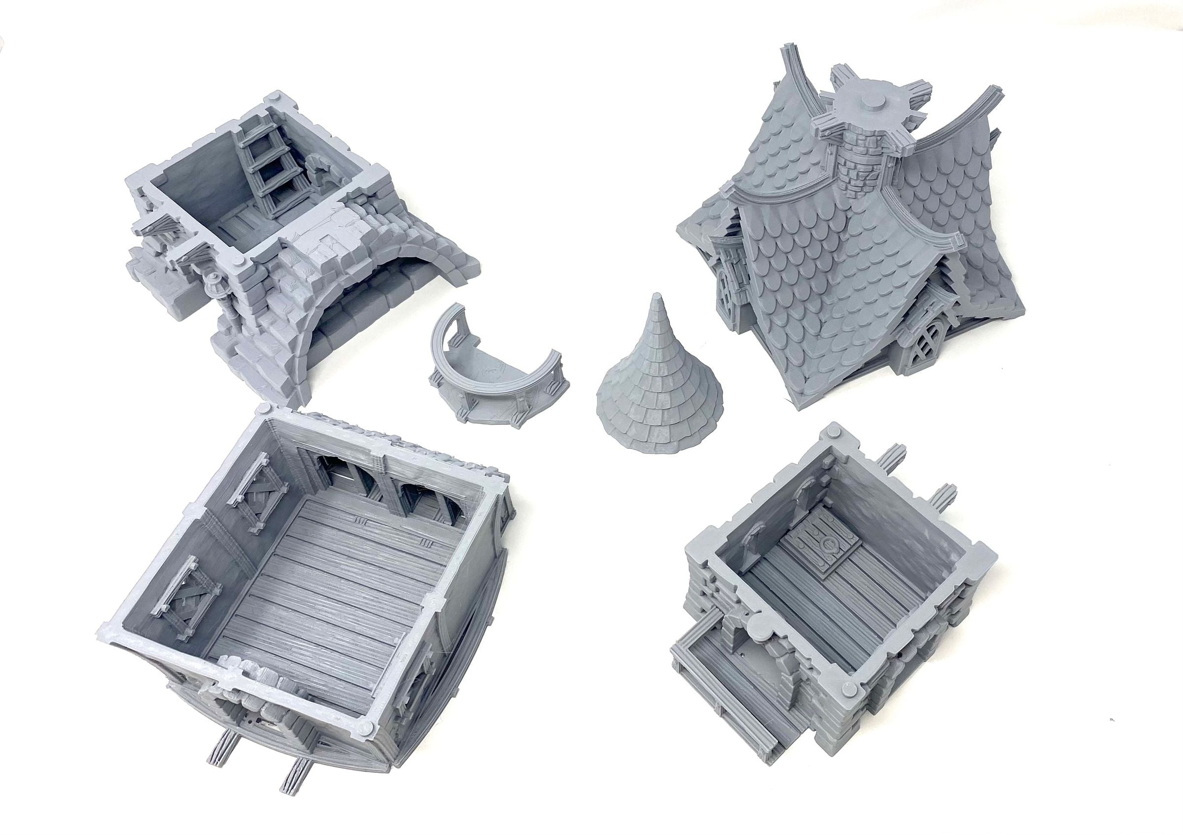 3D printed townhouse, with removable roof and levels and detailed interior. The intricately designed townhouse can be used as a terrain piece for your tabletop game or part of your medieval model village. In any case, it is an absolute eyecatcher!