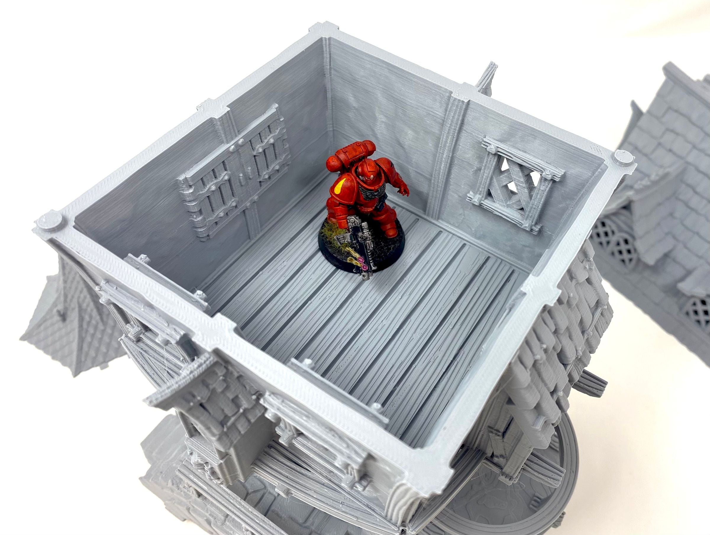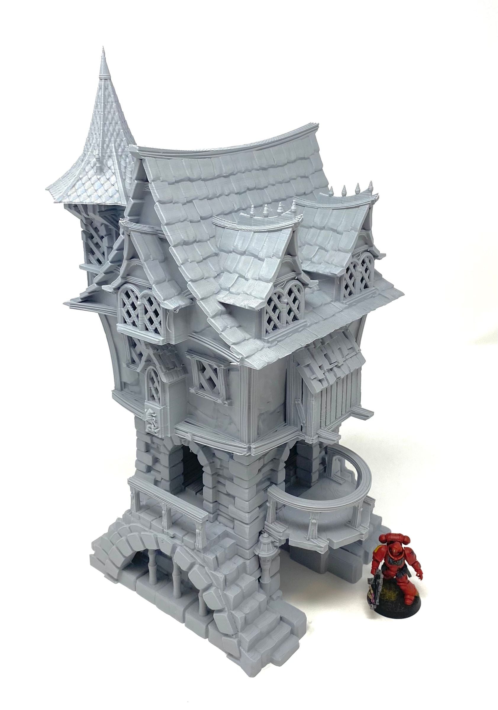 3D printed townhouse, with removable roof and levels and detailed interior. The intricately designed townhouse can be used as a terrain piece for your tabletop game or part of your medieval model village. In any case, it is an absolute eyecatcher!