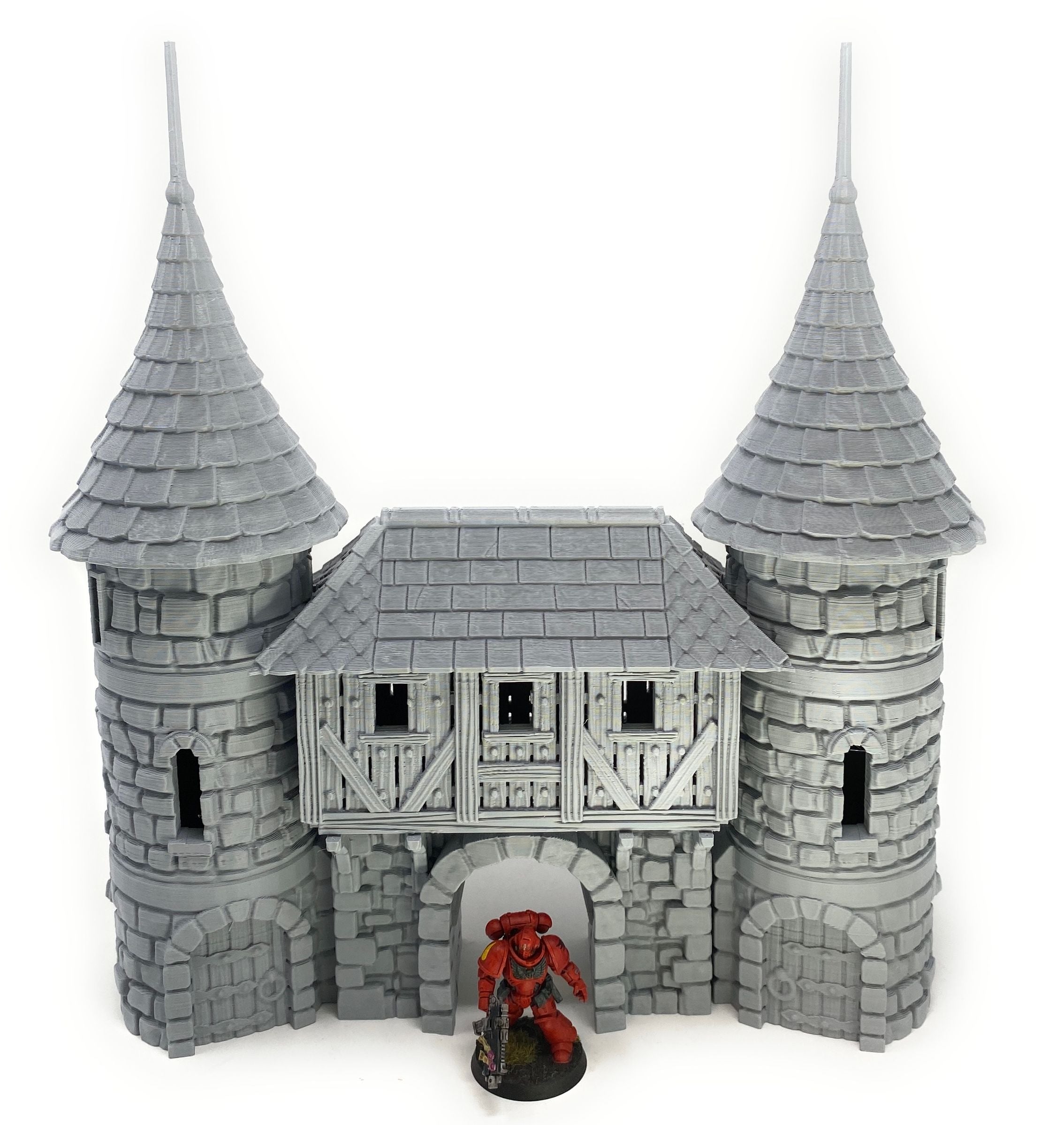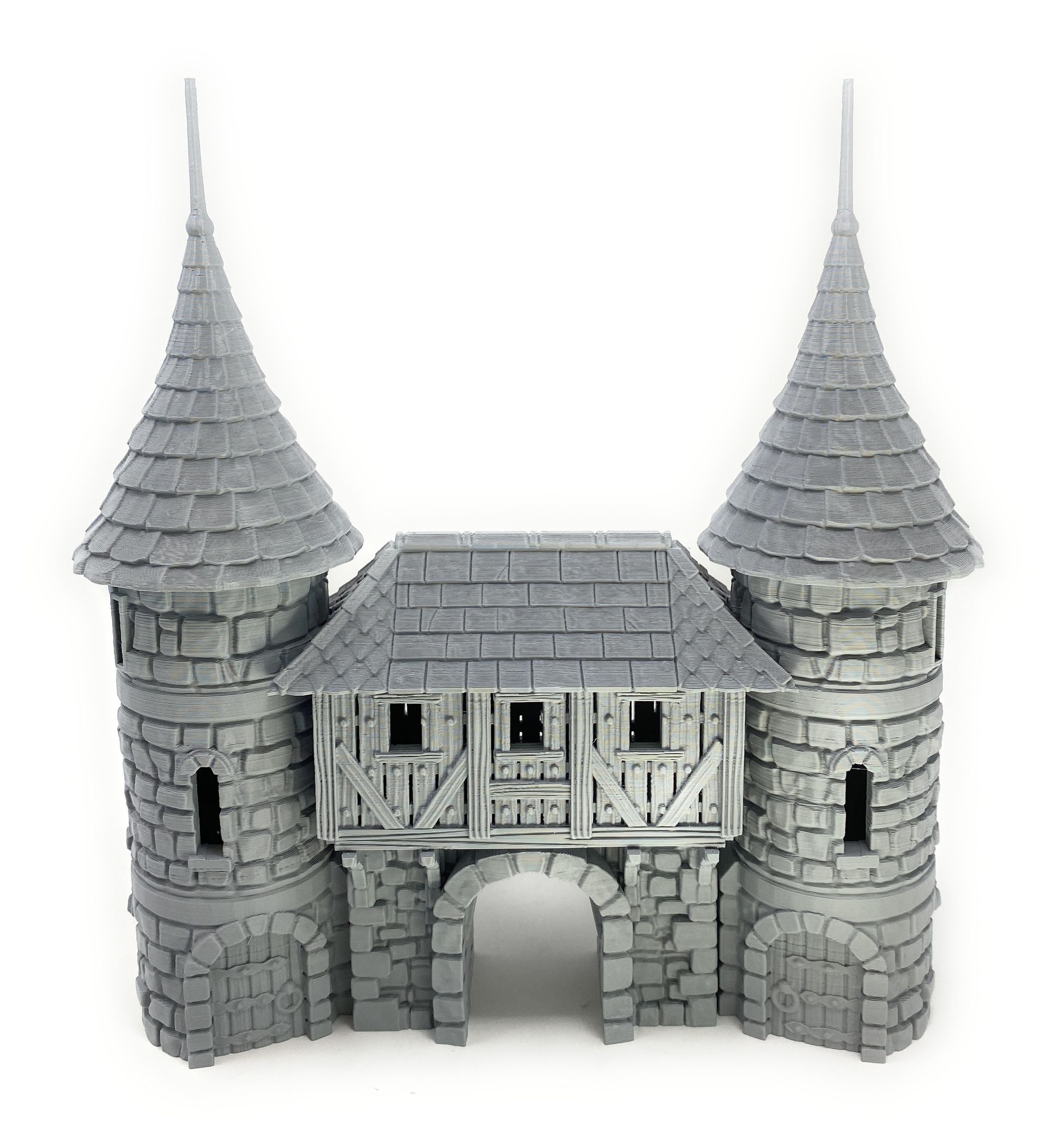 3D printed town gate, with removable roof and levels and detailed interior. The intricately designed town gate can be used as a terrain piece for your tabletop game or part of your medieval model village. In any case, it is an absolute eyecatcher!