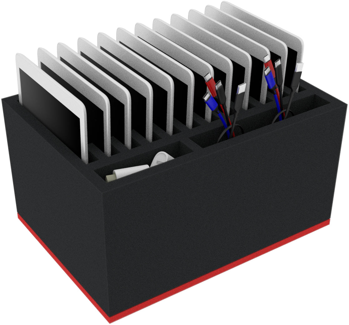 Il robusto inserto in schiuma è dotato di 12 slot per tablet - per vassoi con o senza coperture protettive. Due ulteriori scomparti offrono spazio per cavi, alimentatori e accessori.