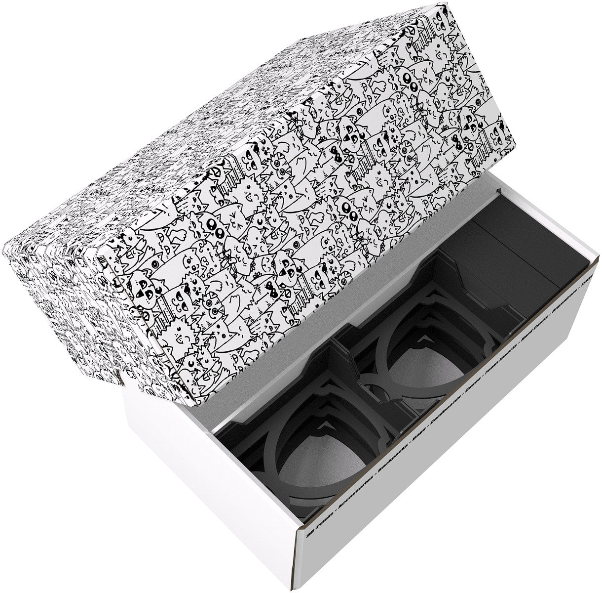 L'Storage Box è composto da due parti, scatola e coperchio, entrambe realizzate in cartone rivestito. Un divisorio al centro della scatola la divide in due scomparti di dimensioni uguali. Il coperchio scorrevole protegge le carte dalla polvere e da altri agenti esterni.