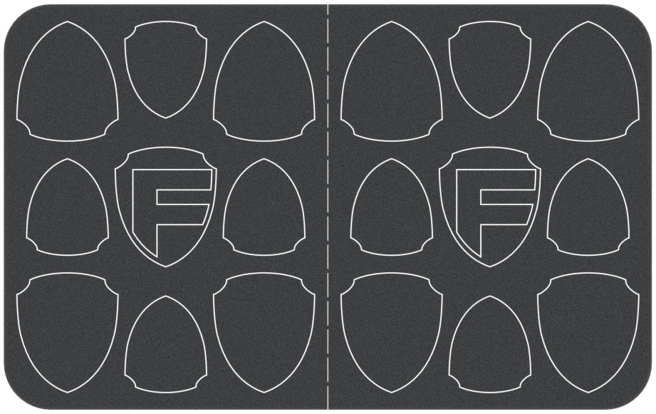 Questo vassoio di schiuma Feldherr contiene 18 supporti Feldherr - tutti a forma di scudo e 2 con i loghi Feldherr.
