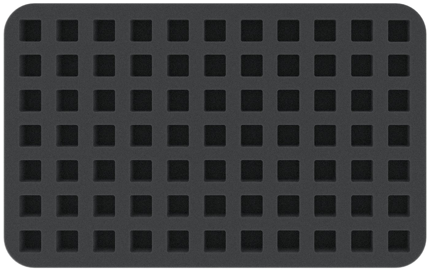Questo vassoio in schiuma Half-Size è suddiviso in 77 scomparti quadrati. È particolarmente adatto per la conservazione ordinata dei dadi, come D6 con bordo di 14 mm di lunghezza.