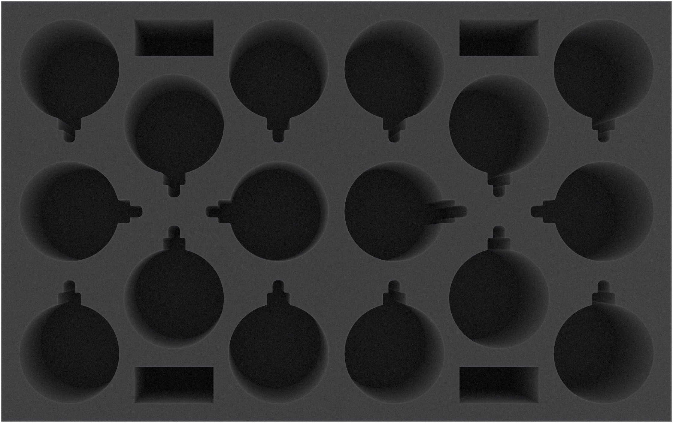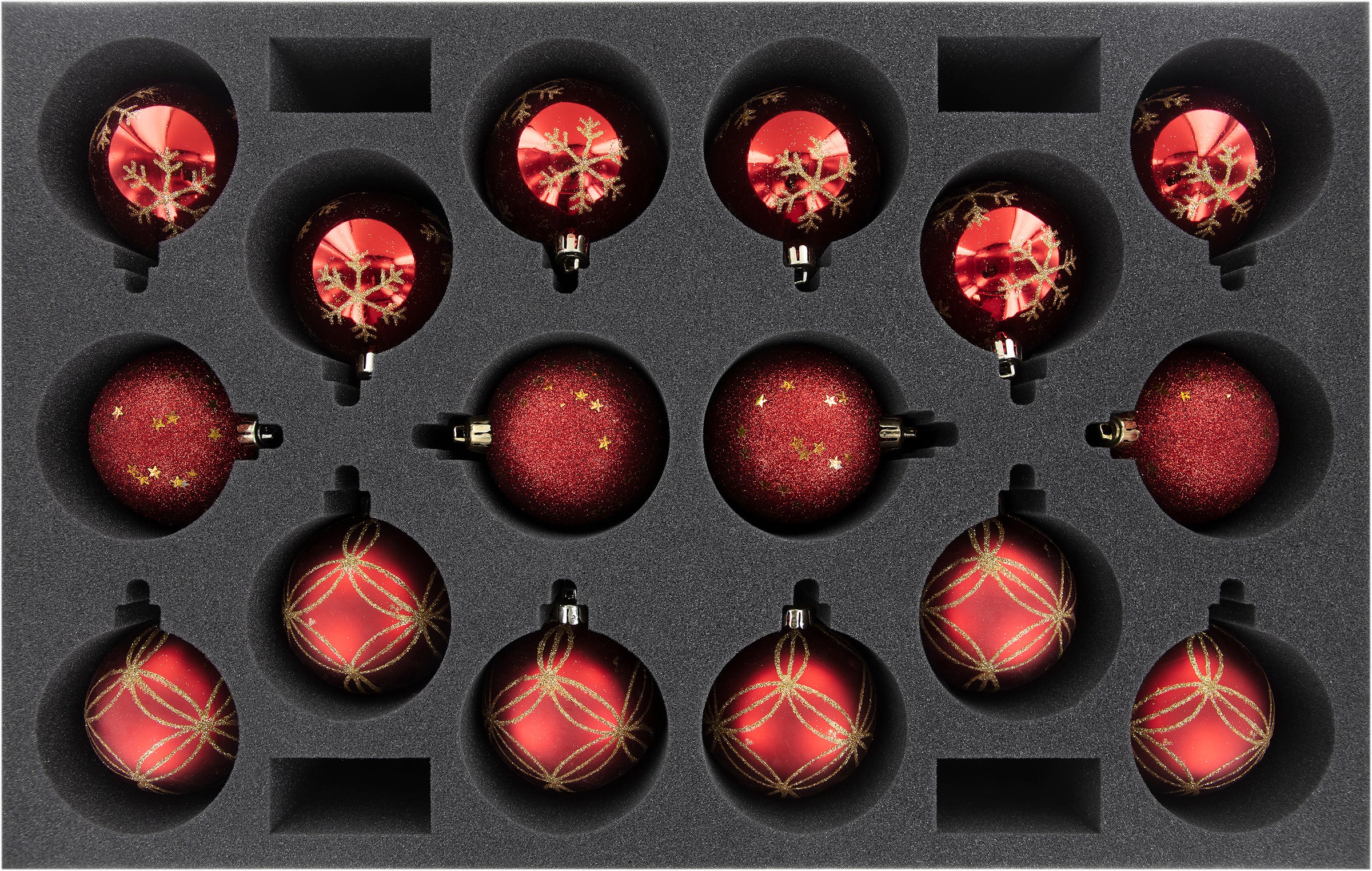 Stesso problema di gingilli come ogni anno? Utilizzando i vassoi in schiuma Feldherr, le delicate sfere decorative sopravvivono senza danni allo stoccaggio e al trasporto. 16 baubles con un diametro di 80 mm ciascuno trovano il loro posto individuale nella morbida schiuma. Anche se cadono da una grande altezza, sopravvivono senza problemi. La cautela è quindi ancora necessaria solo quando si appendono e si tolgono.