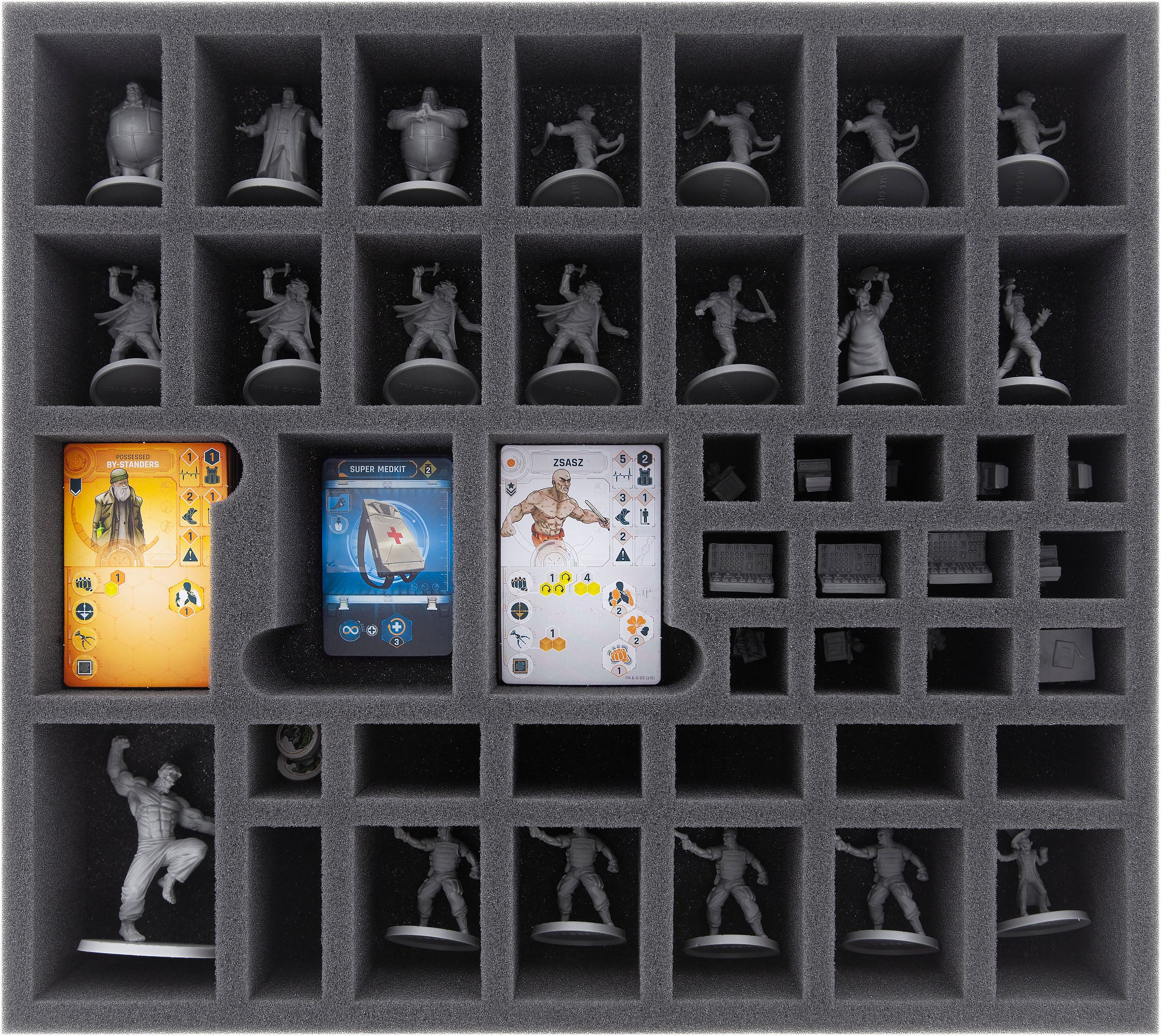 A tutte le 20 miniature dell'espansione Arkham Asylum sono assegnati 20 scomparti personalizzati. Ogni figura ha il proprio scomparto ed è quindi protetta in modo ottimale contro i danni. Joker's Gang rimane armato e il professor PYG tiene anche l'ascia del macellaio.